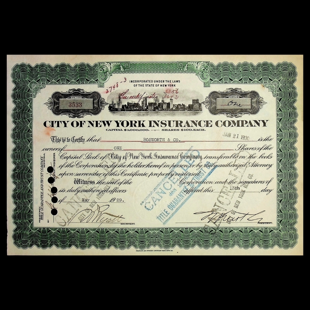 City of New York Insurance Company stock certificate dated 1929, with a Manhattan skyline vignette. Issued to Bosworth & Co., bearing stamps, hand notations, and cancels. Issued, cancelled. Offered as a collectible.