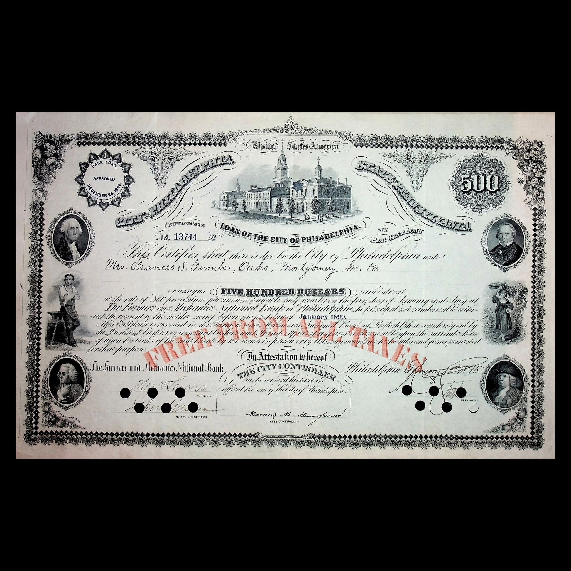 This bond represents an important period in Philadelphia's municipal finance history. The city was able to issue such bonds due to its strong financial position in the mid-1800s, when Philadelphia remained a major cultural and financial center of the United States. Municipal bonds like this one were significant financial instruments, and their interest was traditionally exempt from taxation - a tax break that dated back more than 100 years.