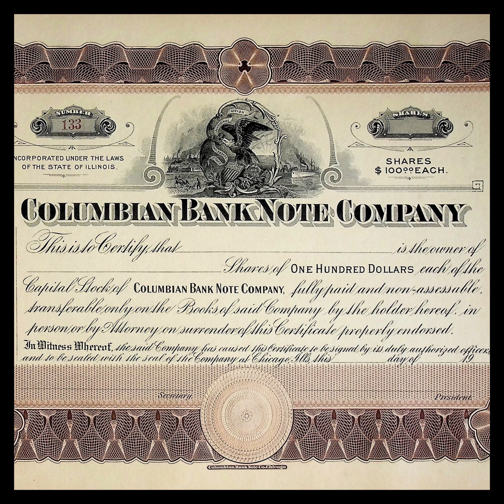 The Columbian Bank Note Company, based in the United States, was a competitor to firms like the American Bank Note Company and Security Bank Note Company. It specialized in printing secure documents including stocks, bonds, checks, and other financial instruments for banks, corporations, and municipalities during the late 19th and early 20th centuries. Its high-quality engraved output was a trusted part of American financial infrastructure.
