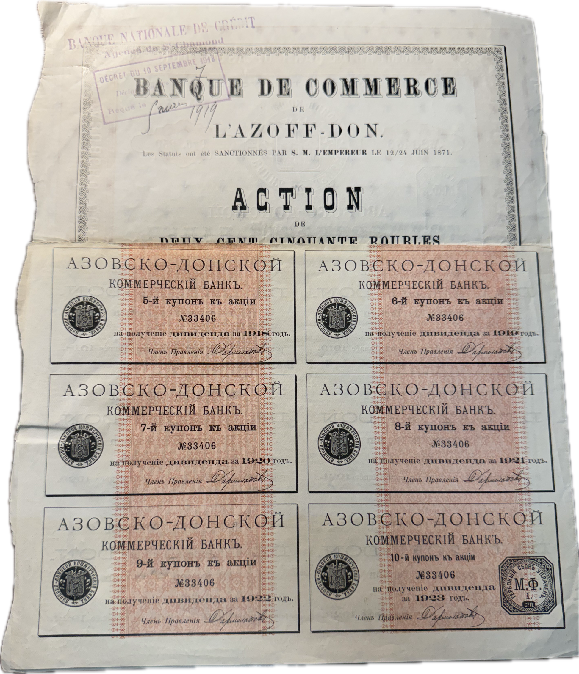 The bank was listed on both the Berlin Stock Exchange (1910) and Paris Stock Exchange (1911). By 1914, when this certificate was issued, foreign capital made up about 45% of the bank's holdings. The bank's existence came to an end following the Russian Revolution when it was nationalized in December 1917 along with other commercial banks, with no compensation provided to shareholders.