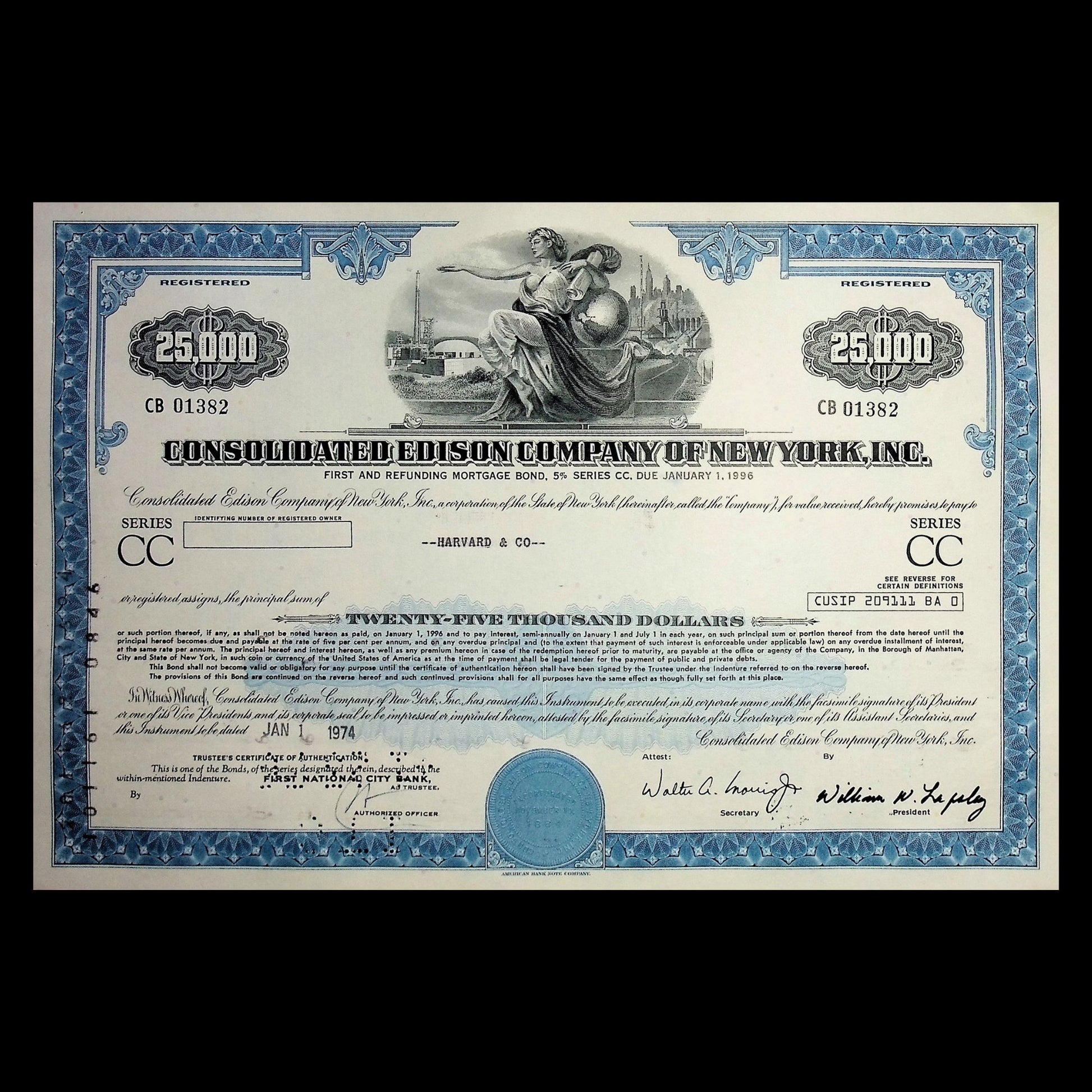 Consolidated Edison (ConEd) Company of New York $25,000 Bond Certificate from 1970s