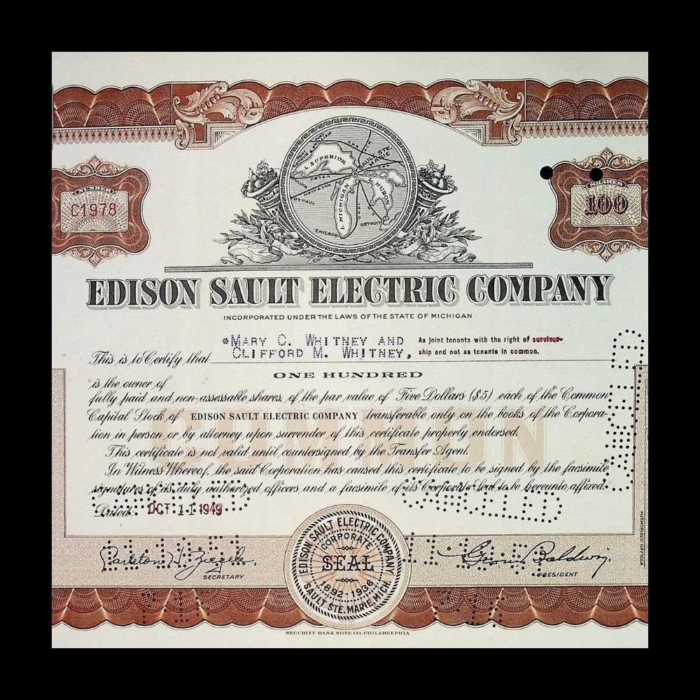 This is a stock certificate dated in the mid-20th century, issued by the Edison Sault Electric Company of Sault Ste. Marie, Michigan. It was issued and later cancelled. Offered as a collectible.