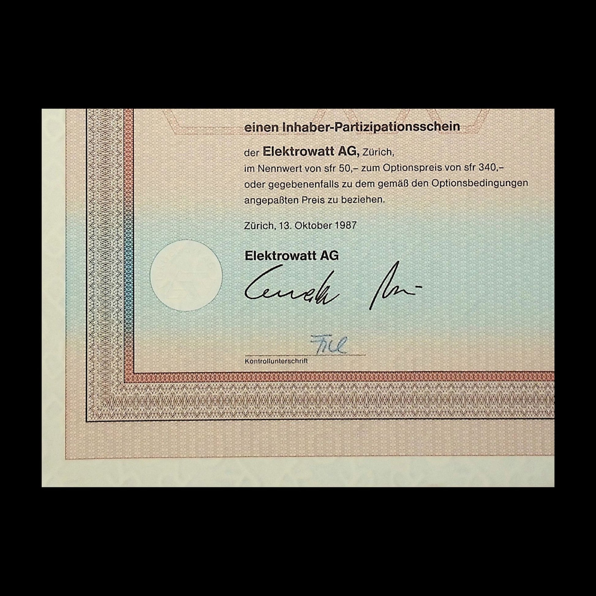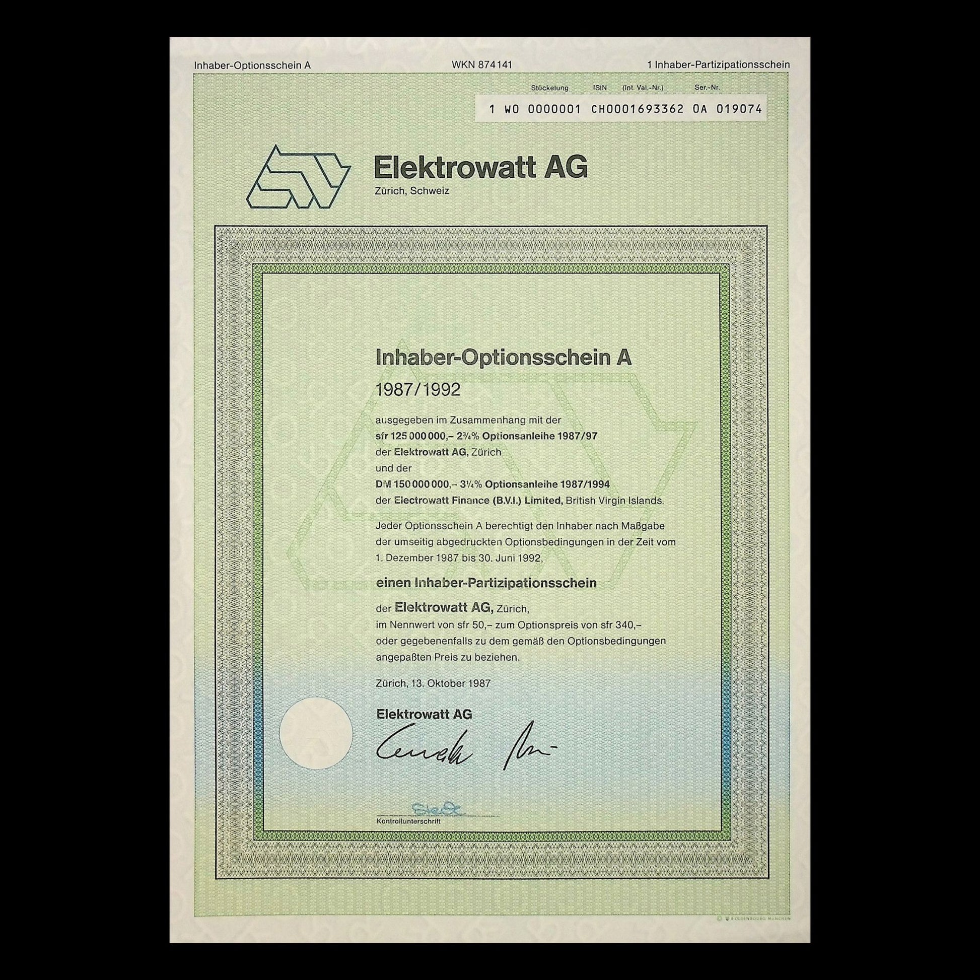 Elektrowatt AG (Zurich, Switzerland) Warrant Certificate from 1987 in German