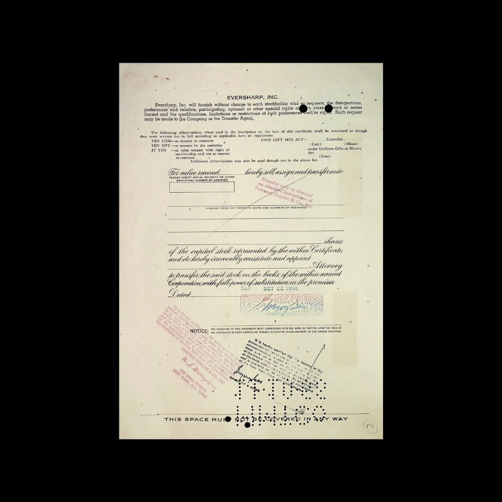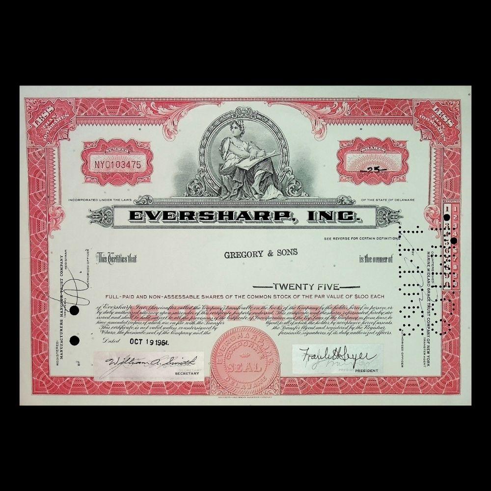 By the 1960s, when this certificate was issued, Eversharp was owned by the Parker Pen Company, which had acquired it in an attempt to consolidate market share in the competitive writing instrument industry.