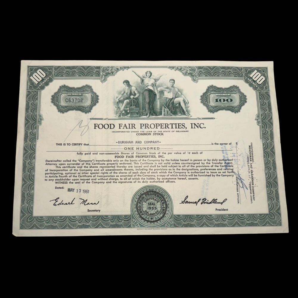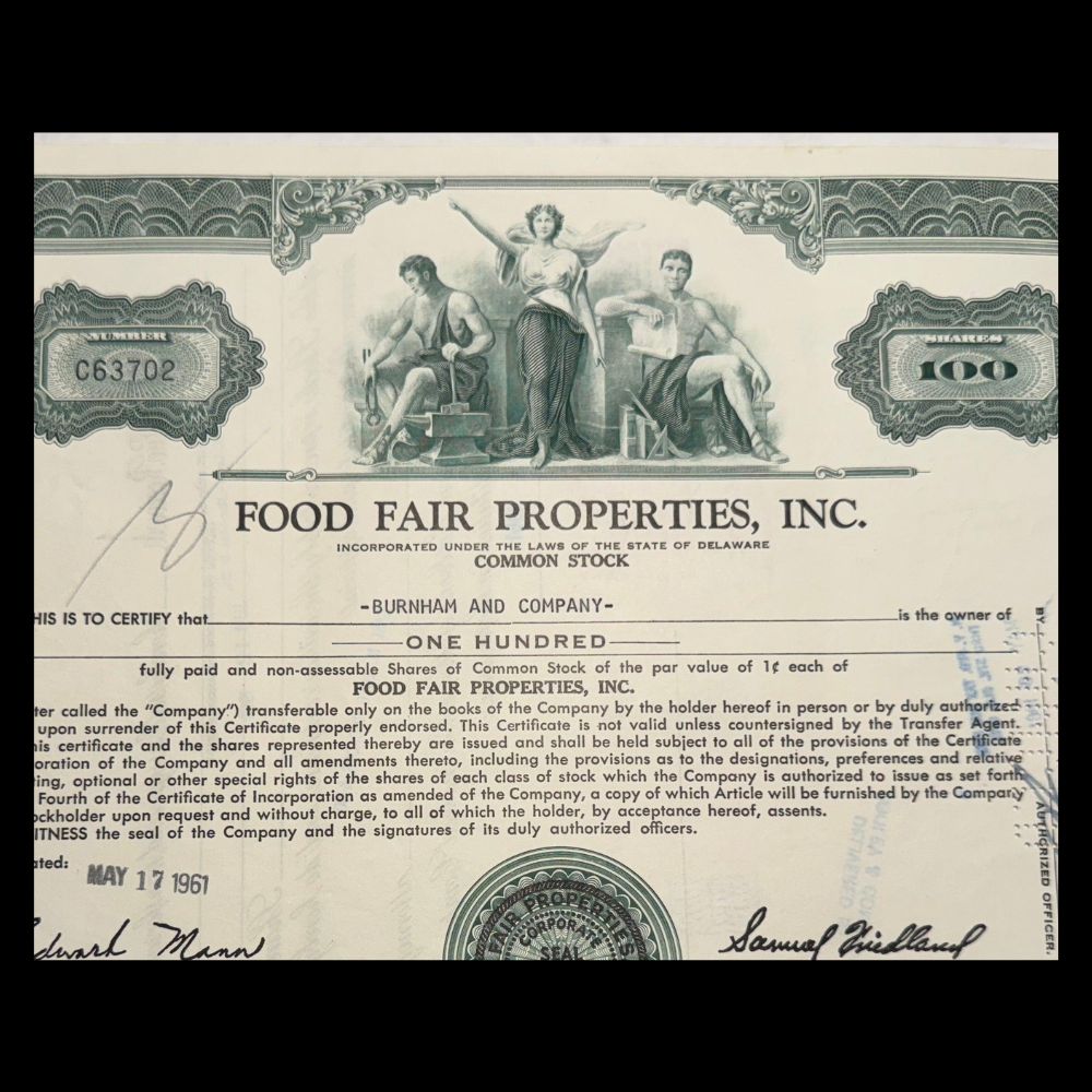 This is a green stock certificate from Food Fair Properties, Inc., issued in 1960s, features cancellation holes, stamps, and handwriting. Offered as a collectable.