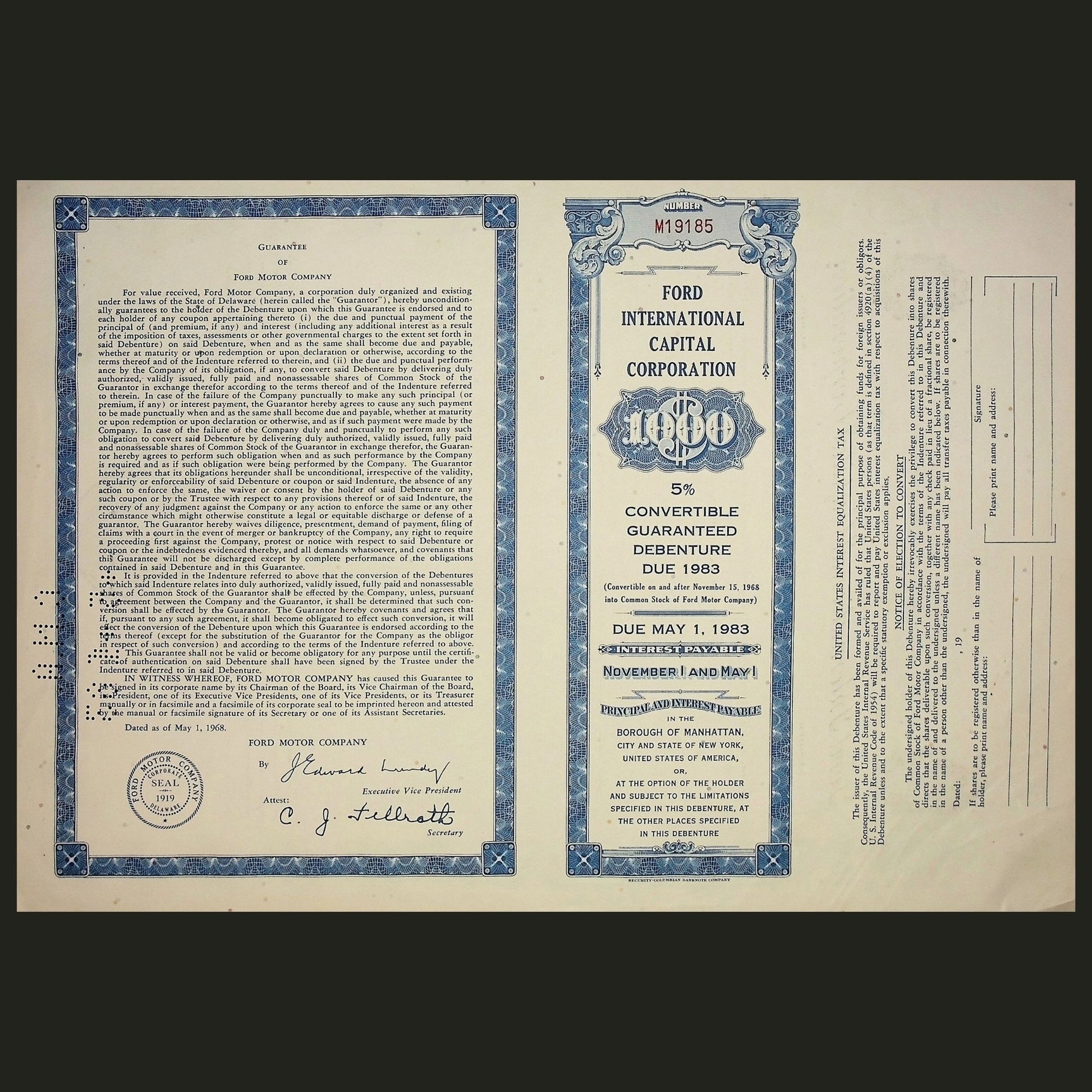 Ford International Capital Corporation Bond Certificate (w/ Henry Ford) from 1968