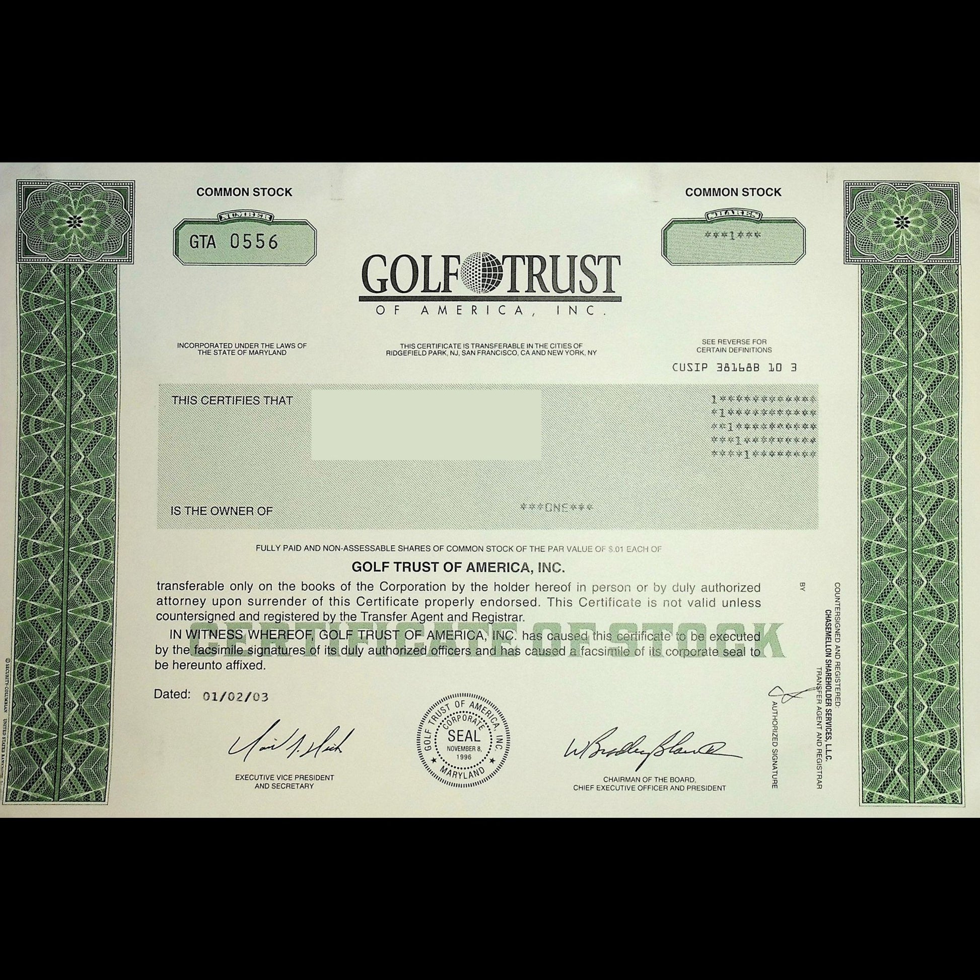 Golf Trust of America was a unique real estate investment trust (REIT) as it was formed to take advantage of opportunities to consolidate golf course ownership in the United States. It was founded by W. Bradley Blair, II, IPO'd in February of 1997. It was dissolved in 2001-2003, when this certificate was issued.