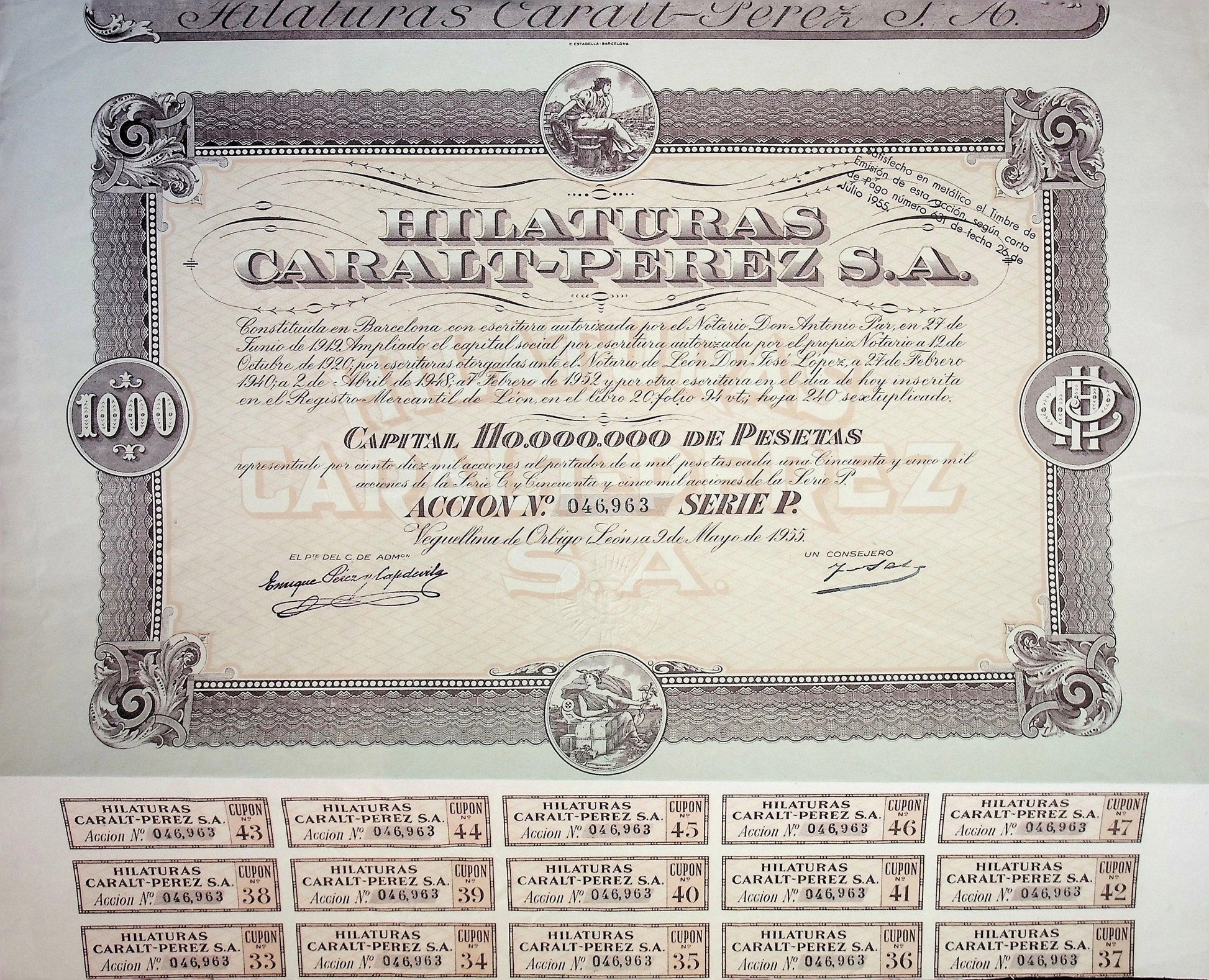 Hilaturas Caralt-Perez Bond Certificate (Spanish textile co)