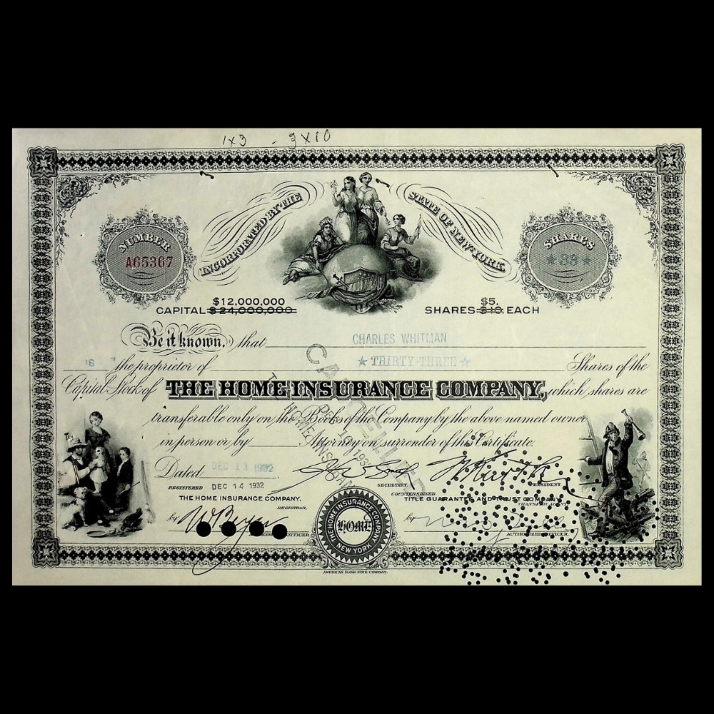 Home Insurance Company stock certificate dated 1932, printed by American Bank Note Company, with punch cancels and office stamps. Issued, cancelled. Offered as a collectible.