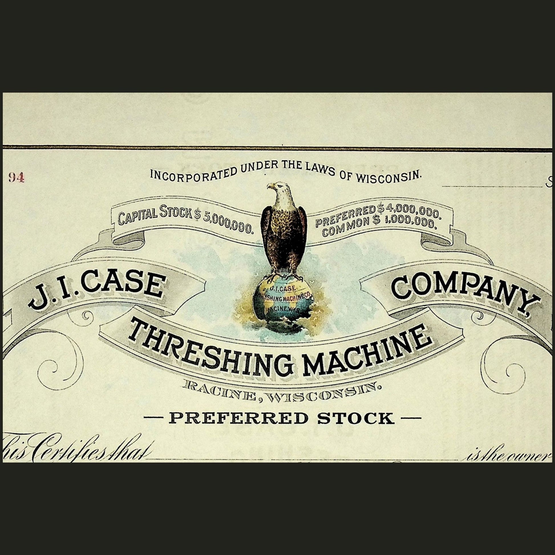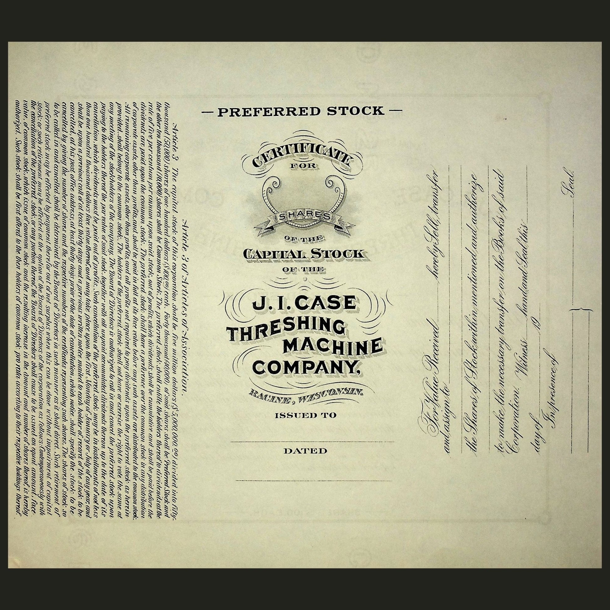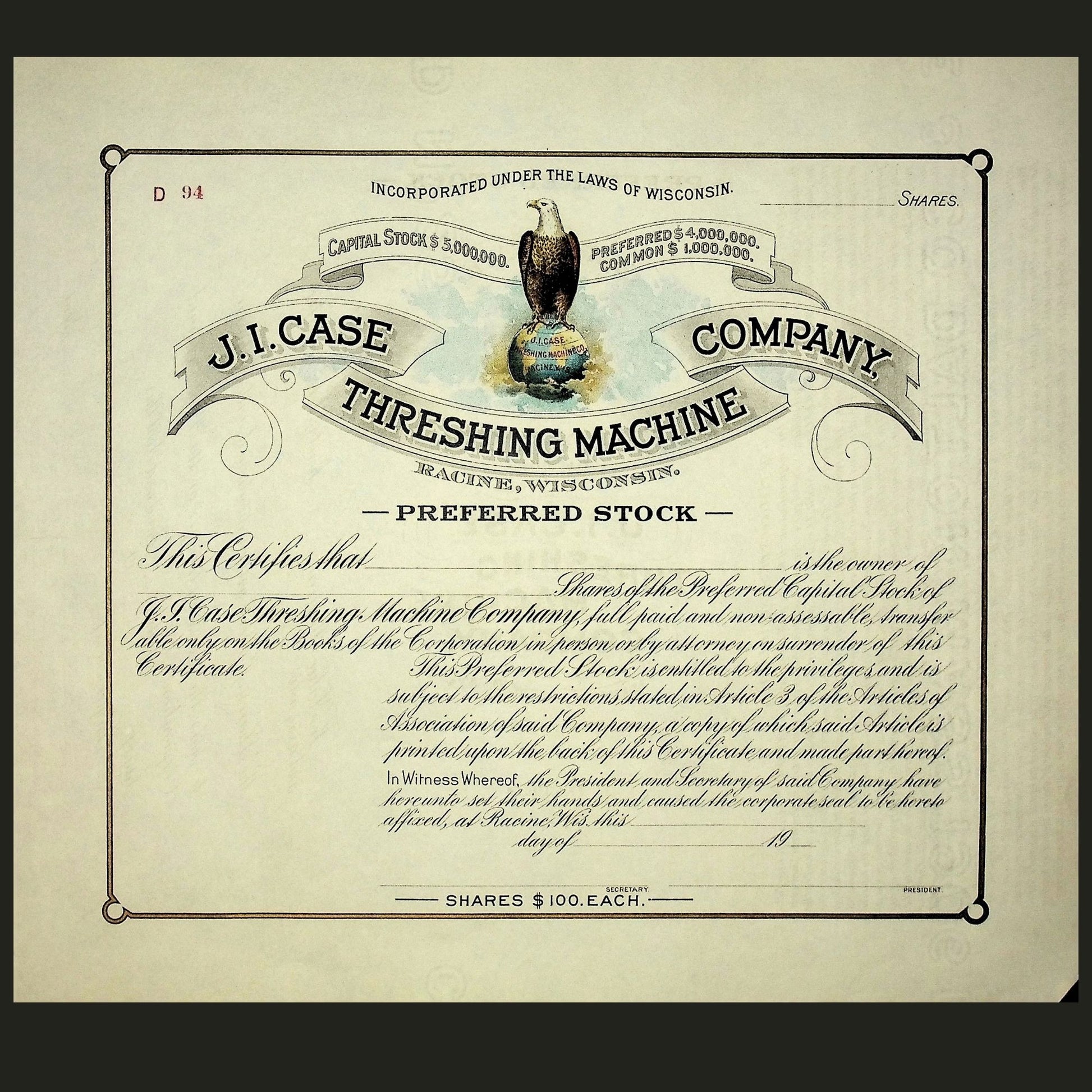 This is a rare, colorful, unissued stock certificate from the J.I. Case Company Threshing Machine Company. Likely from ~1912, offered as a collectable
