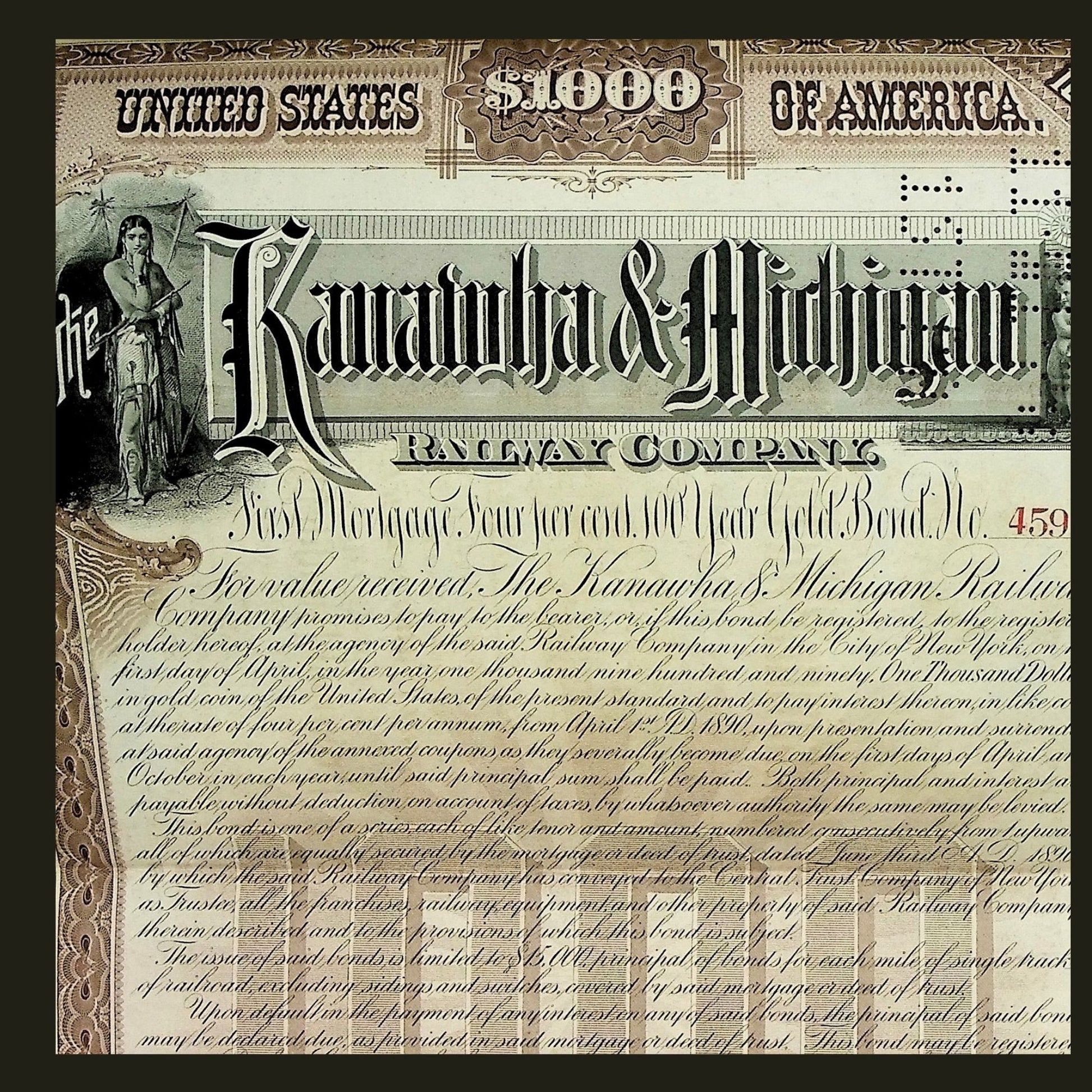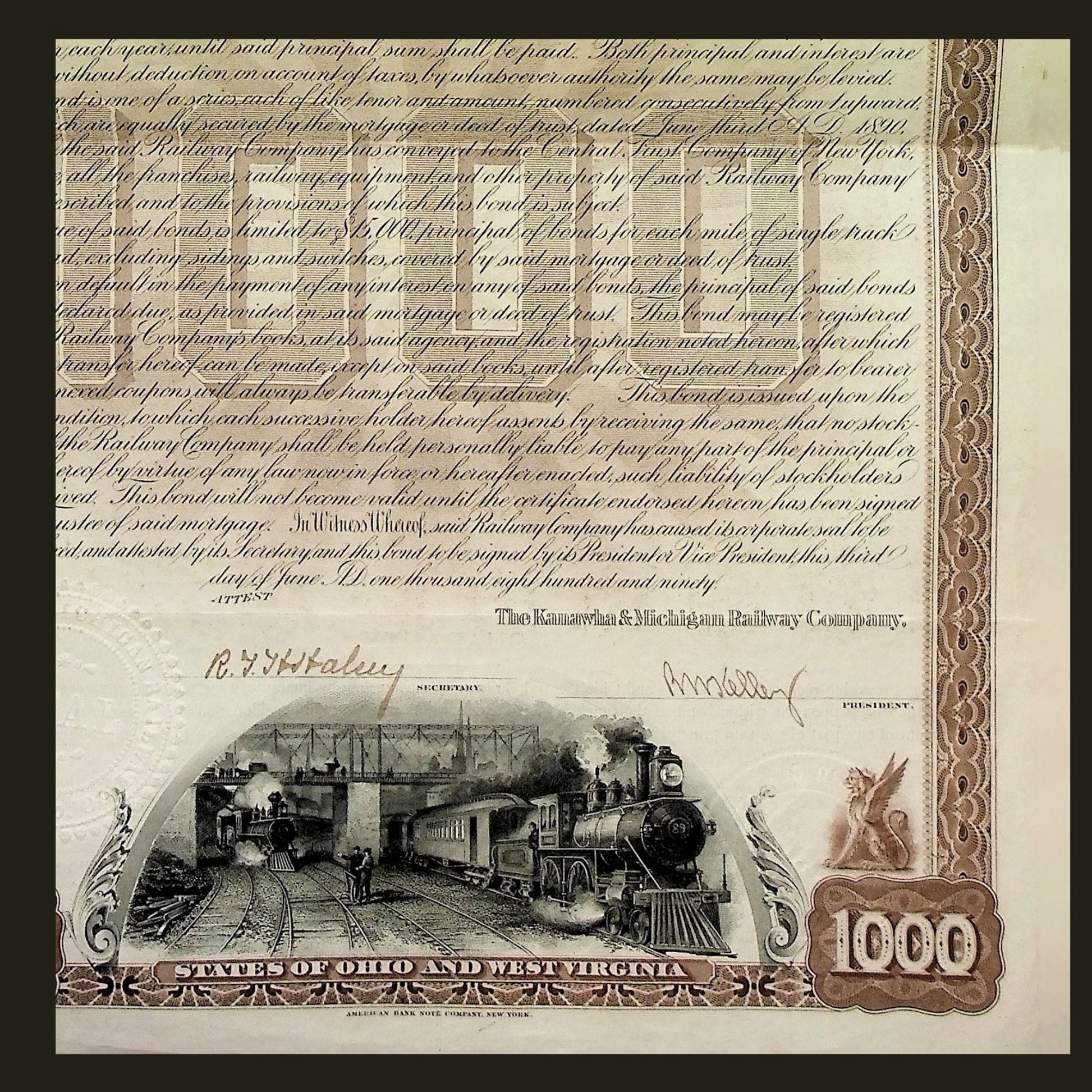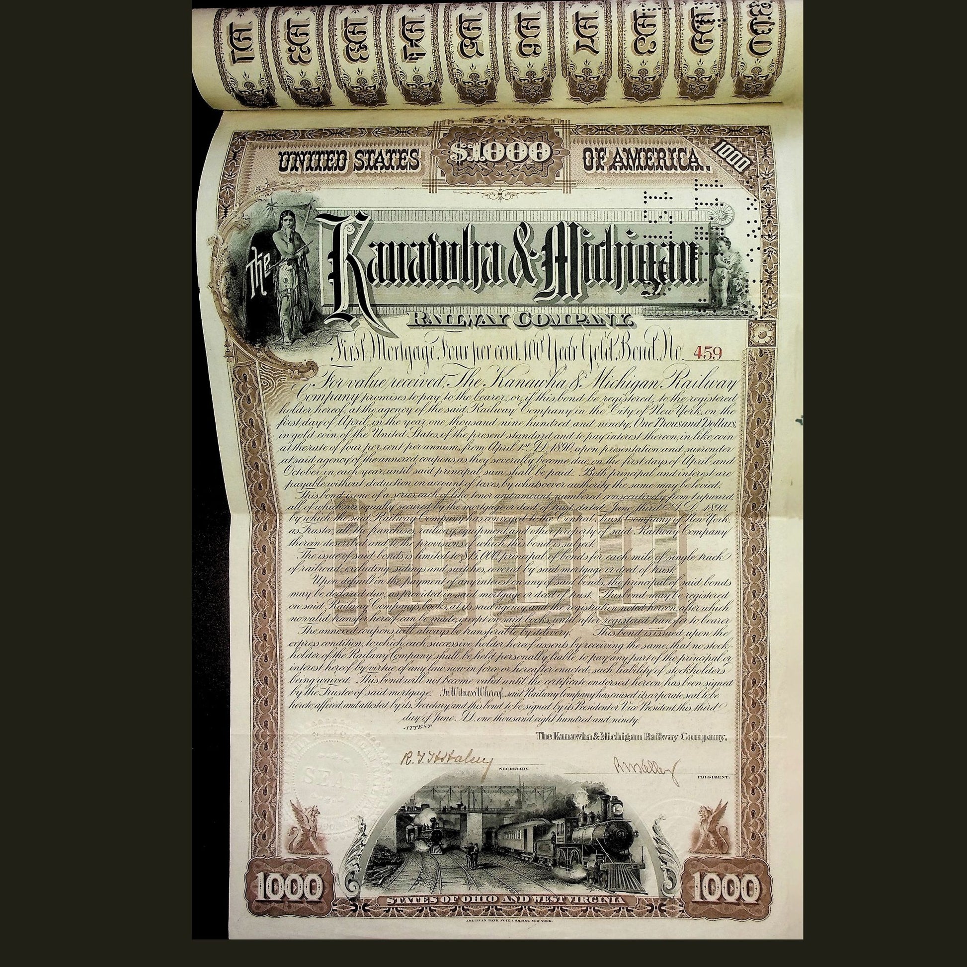 Kanawha & Michigan (West Virginia and Ohio) Railway Company Bond from 1890