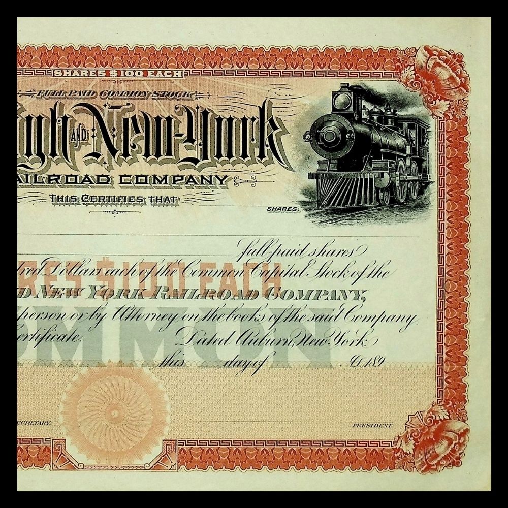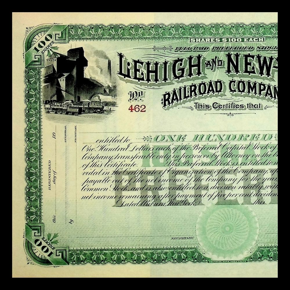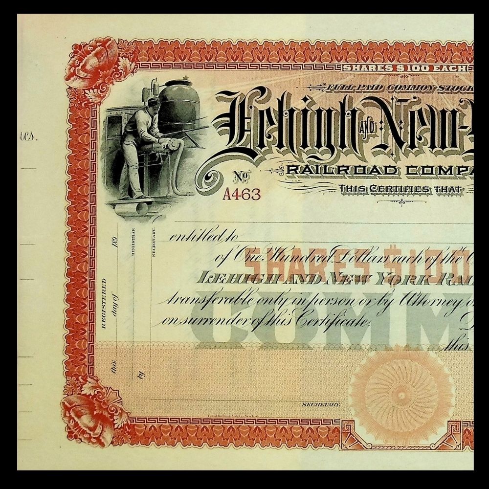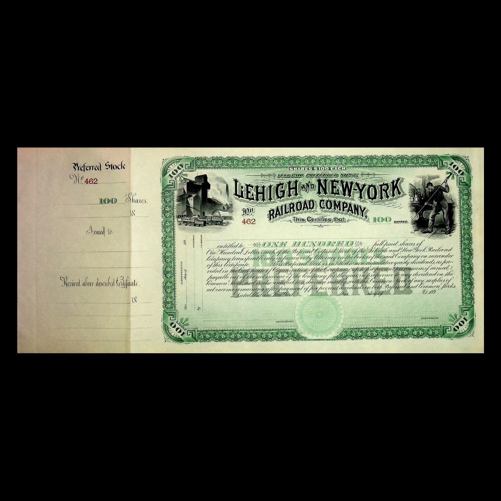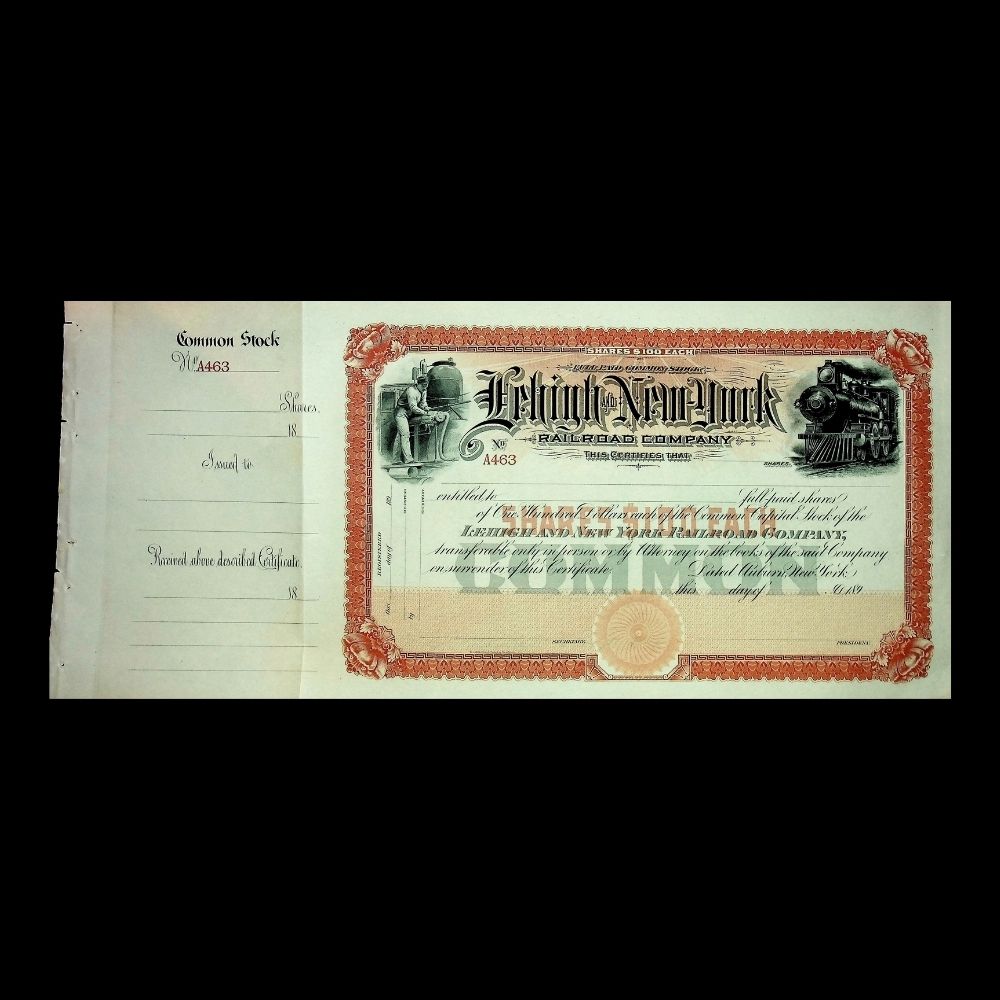 Your choice of orange or green unissued Lehigh and New York Railroad Company stock certificates from the 1890s. Printed in green or orange, these certificate remains unissued and still retains its stock book attachment with matching serial numbers. Offered as a collectable.