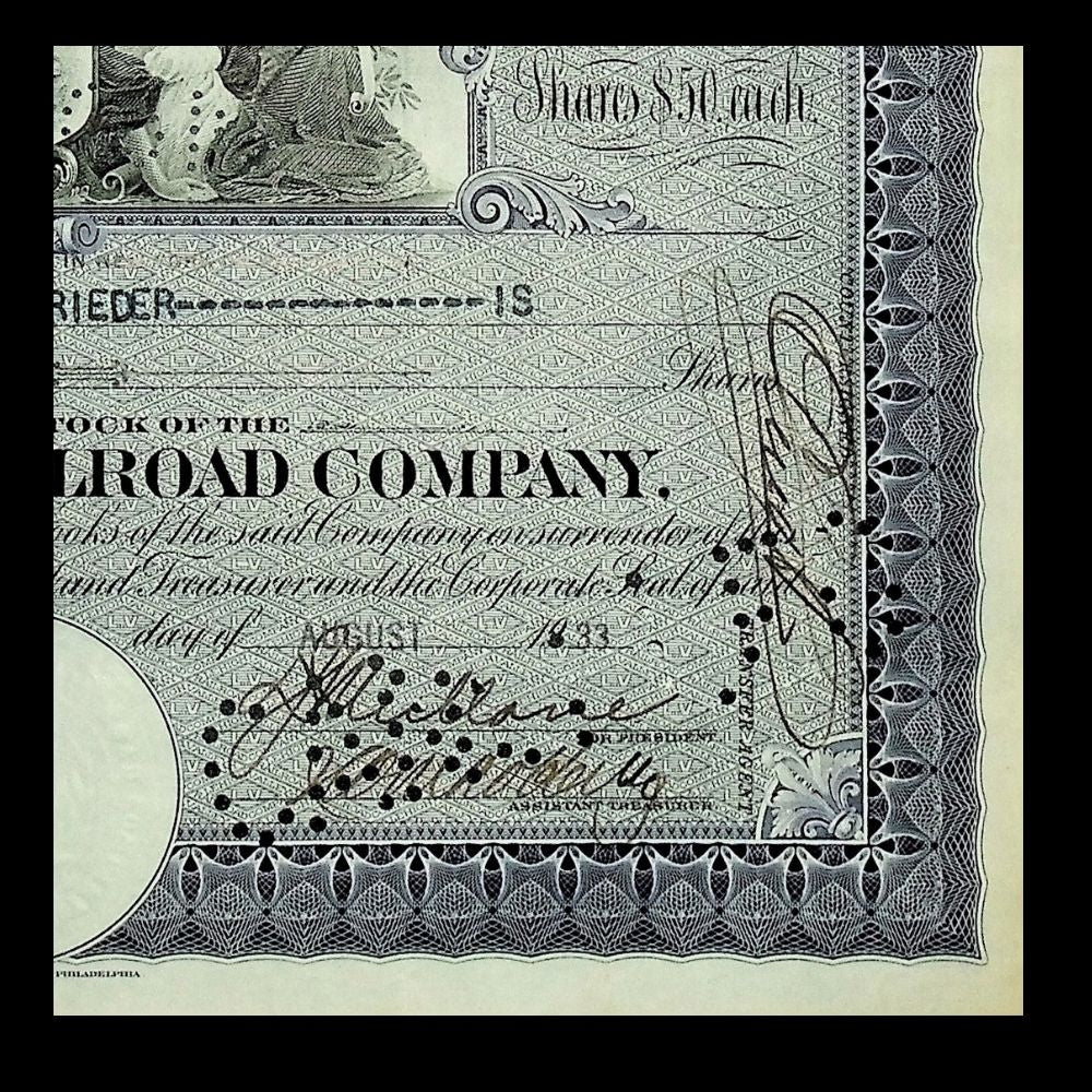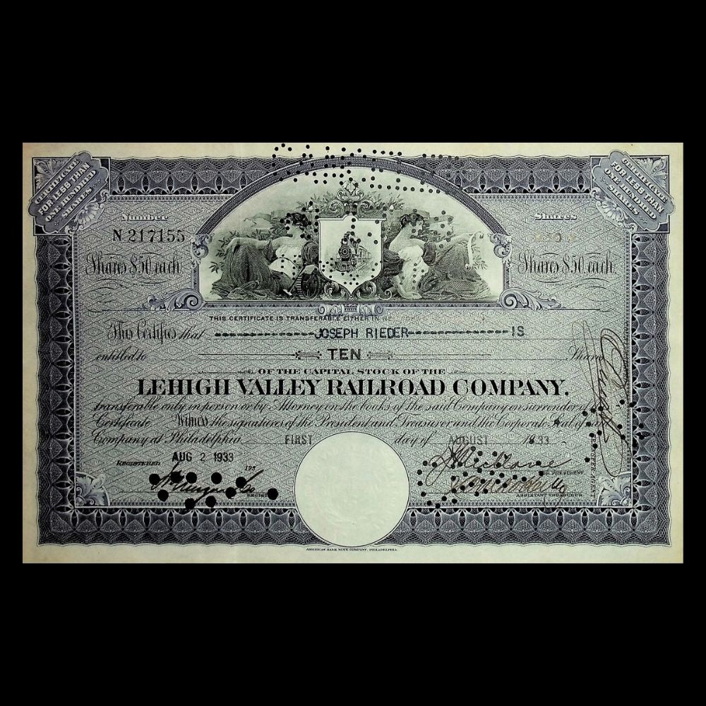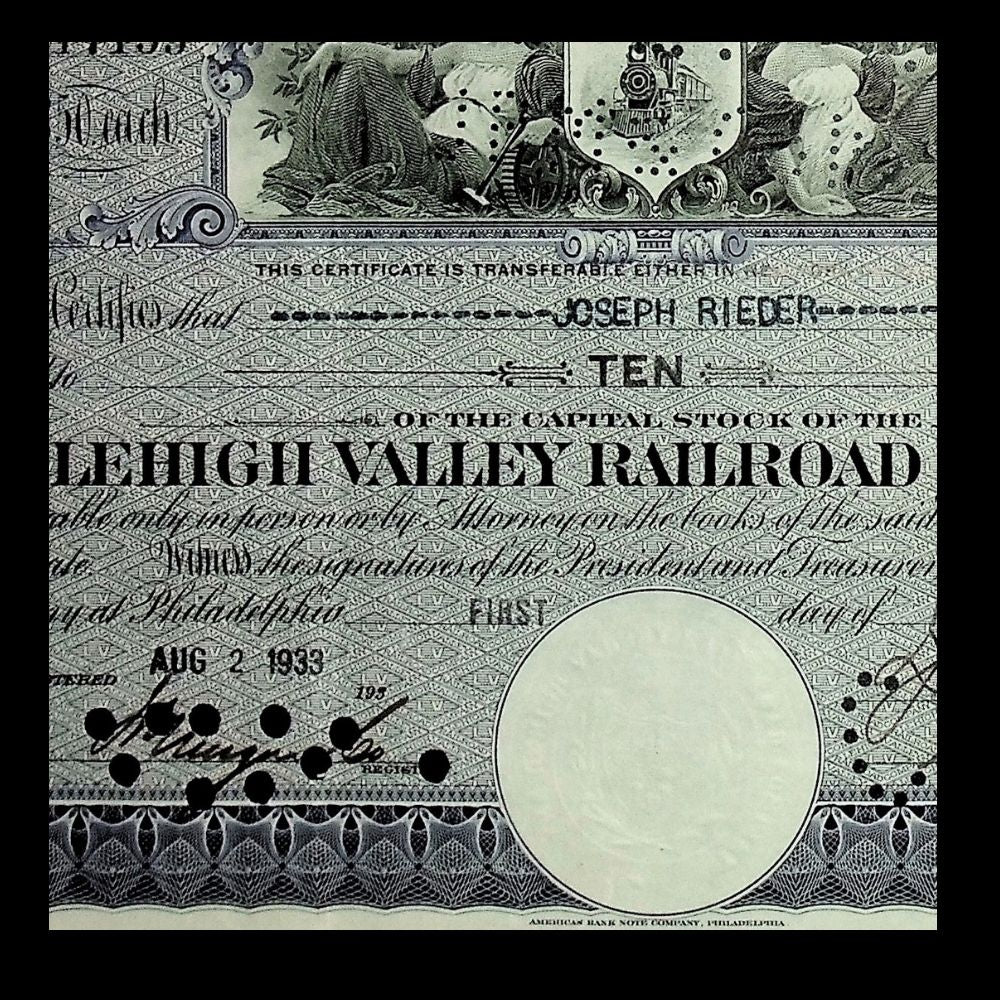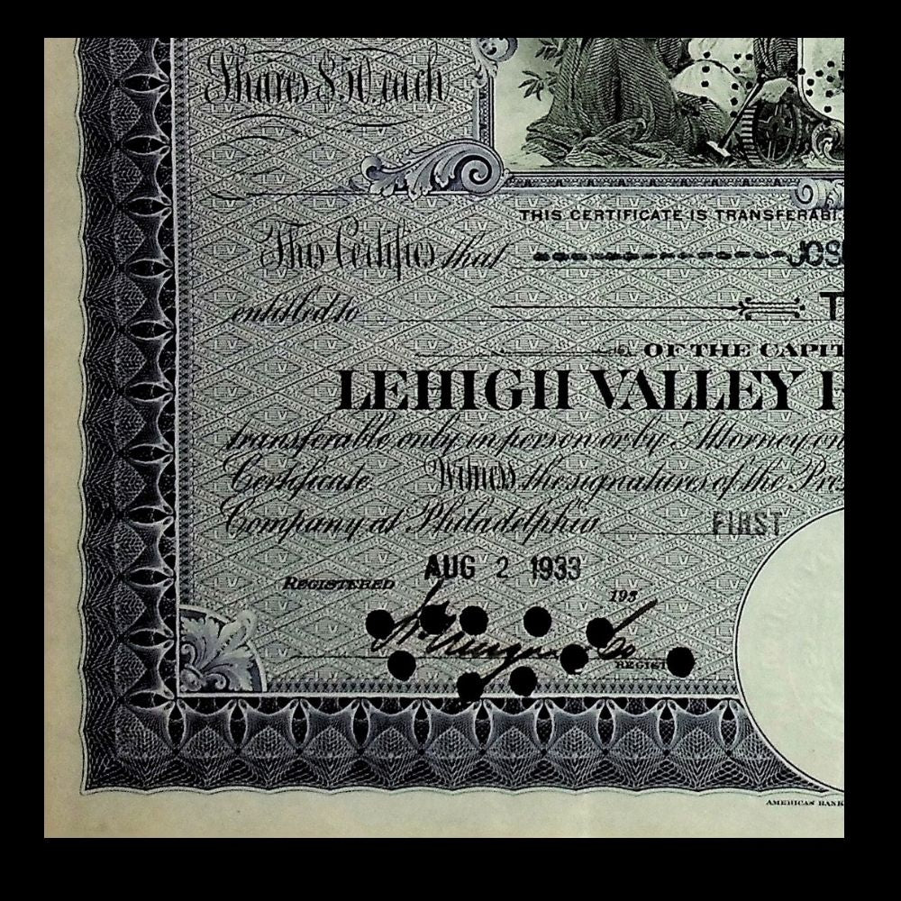 The Lehigh Valley Railroad, incorporated in 1846 in Pennsylvania, was a vital carrier of coal, freight, and passengers across the Lehigh Valley and into New York State. Known as the “Route of the Black Diamond” for its role in transporting anthracite coal, the line played a crucial role in fueling the industrial boom of the late 19th and early 20th centuries. By the 1930s, the company was navigating the challenges of the Great Depression while maintaining its reputation as a key regional railroad. Stock certificates like this were issued to shareholders as legal proof of their stake, combining financial function with the artistry of engraved printing.