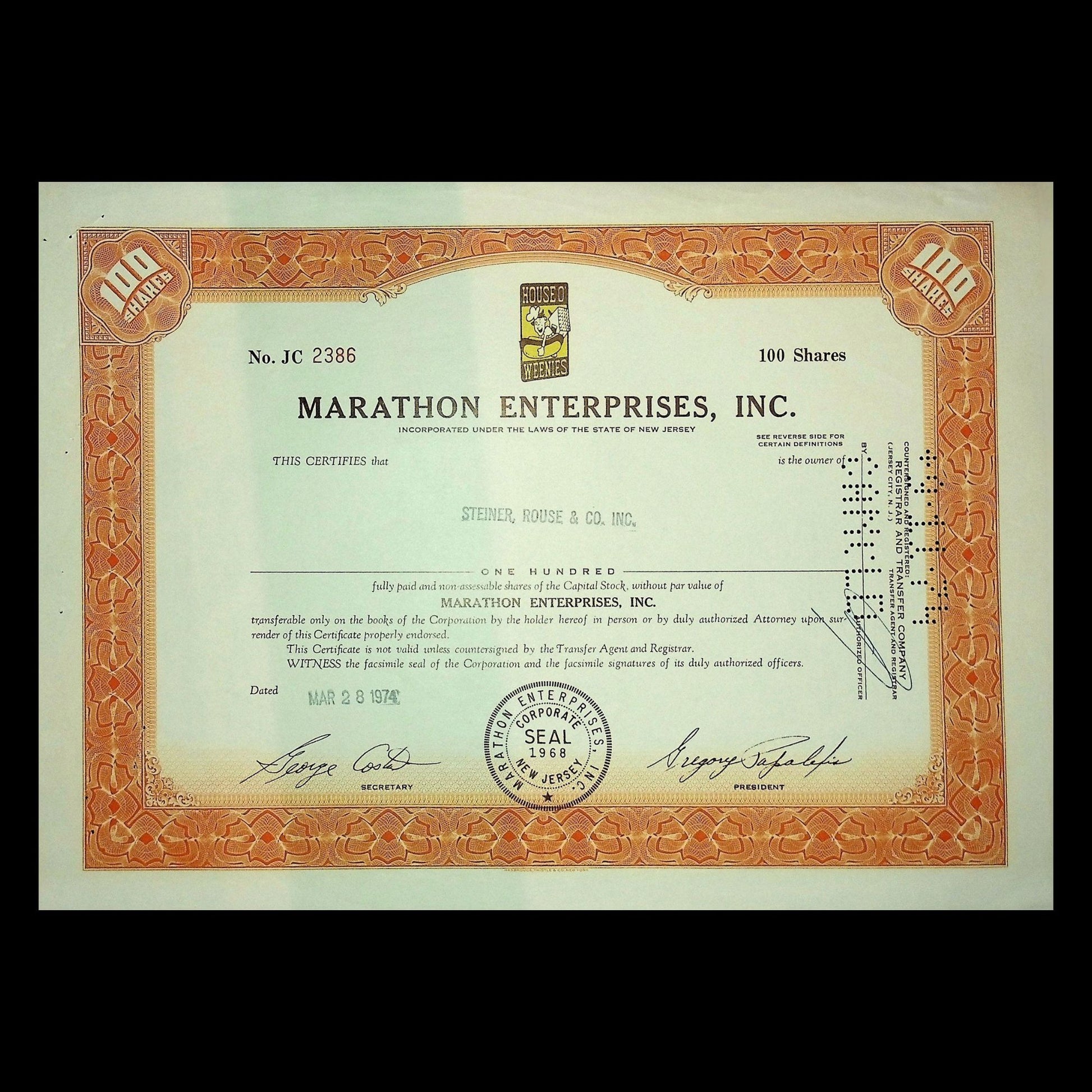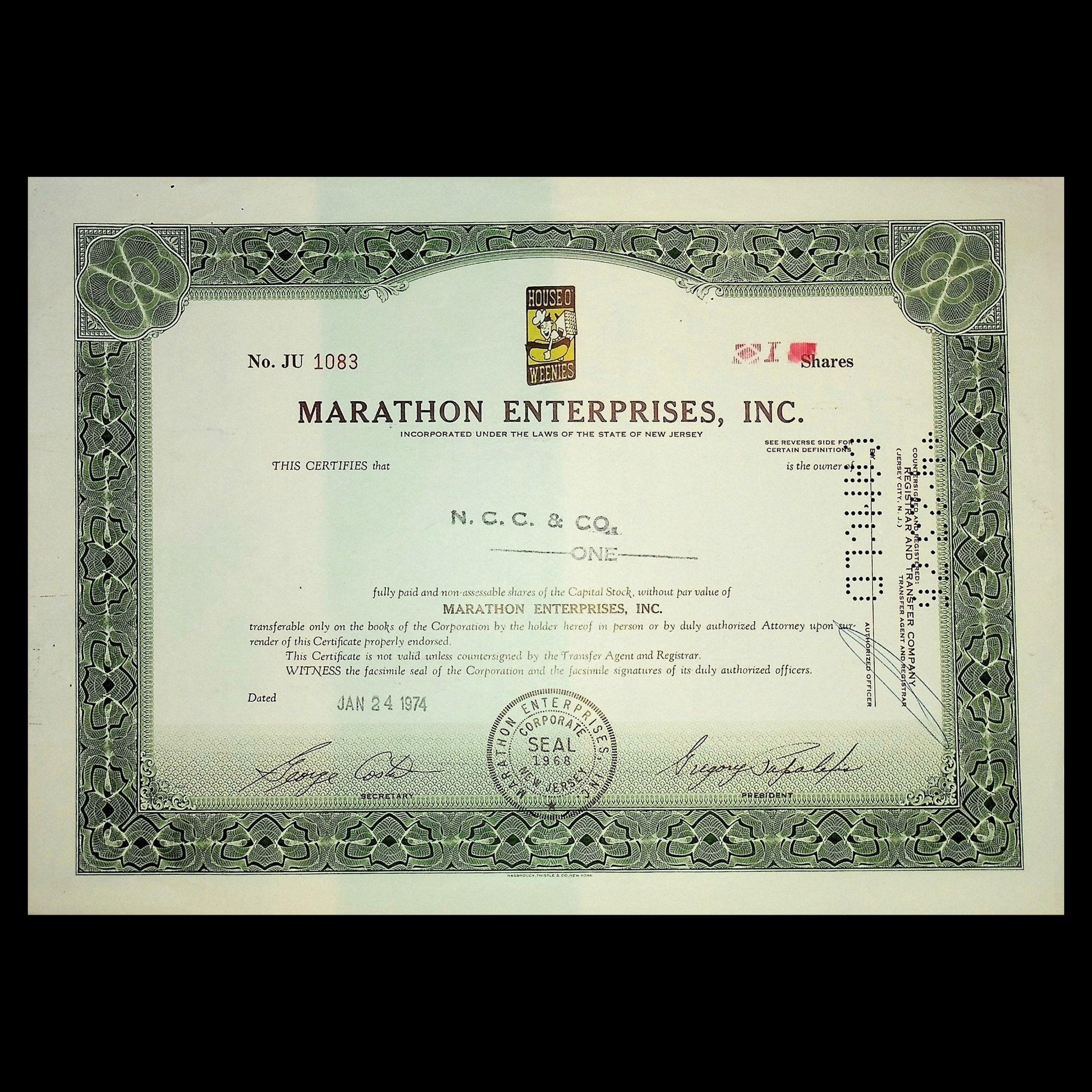 Marathon Enterprises Inc - now Sabrett Hotdogs (House O' Weenies) Stock Certificate from 1970s