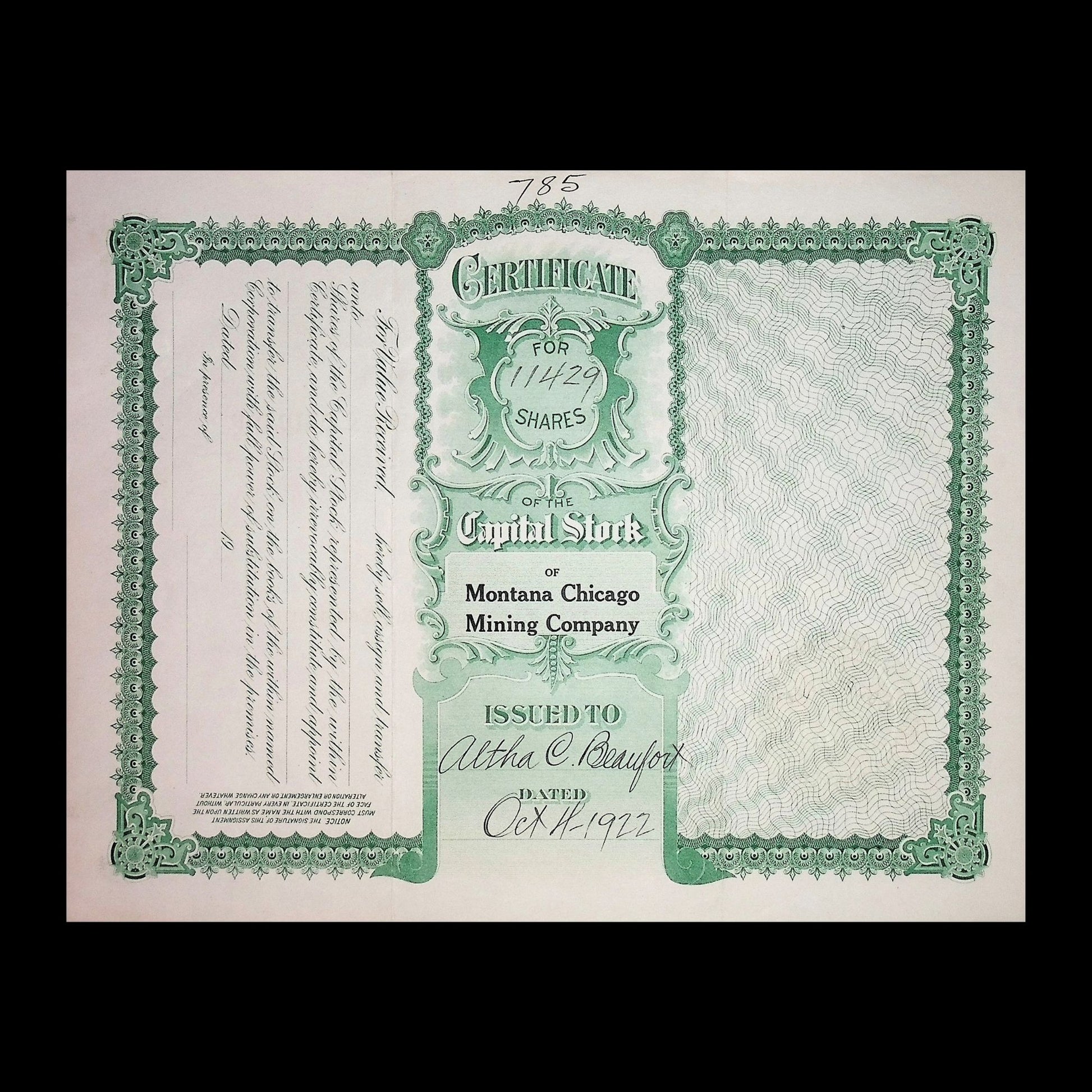 This is an authentic issued and cancelled Montana Chicago Mining Company stock certificate from 1922, featuring an engraved vignette of coal miners at work in the top left corner and a beautifully illustrated ornamental border wrapping around the entire certificate. Officially issued and signed by the company president, it once represented an ownership stake in an early 20th-century mining enterprise.