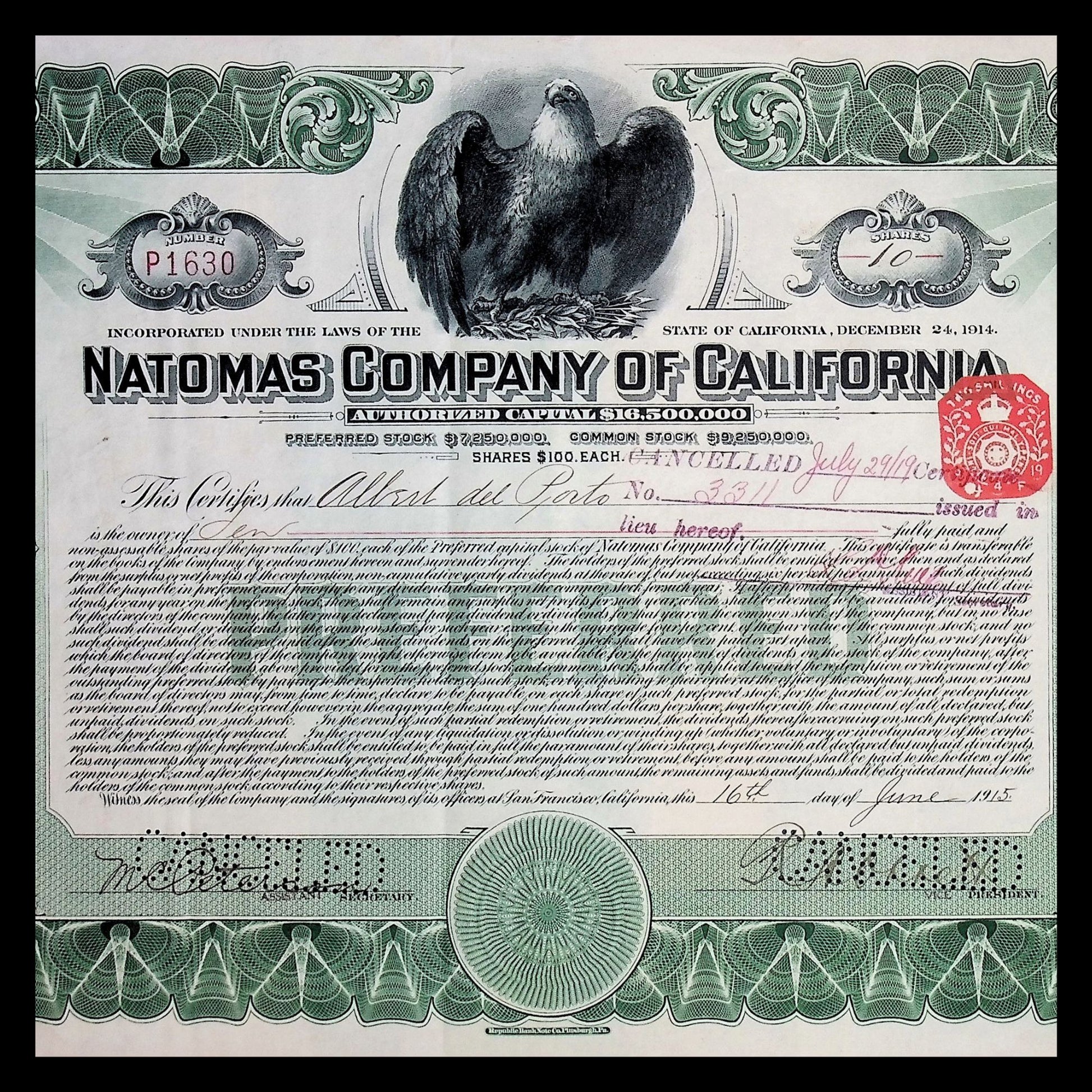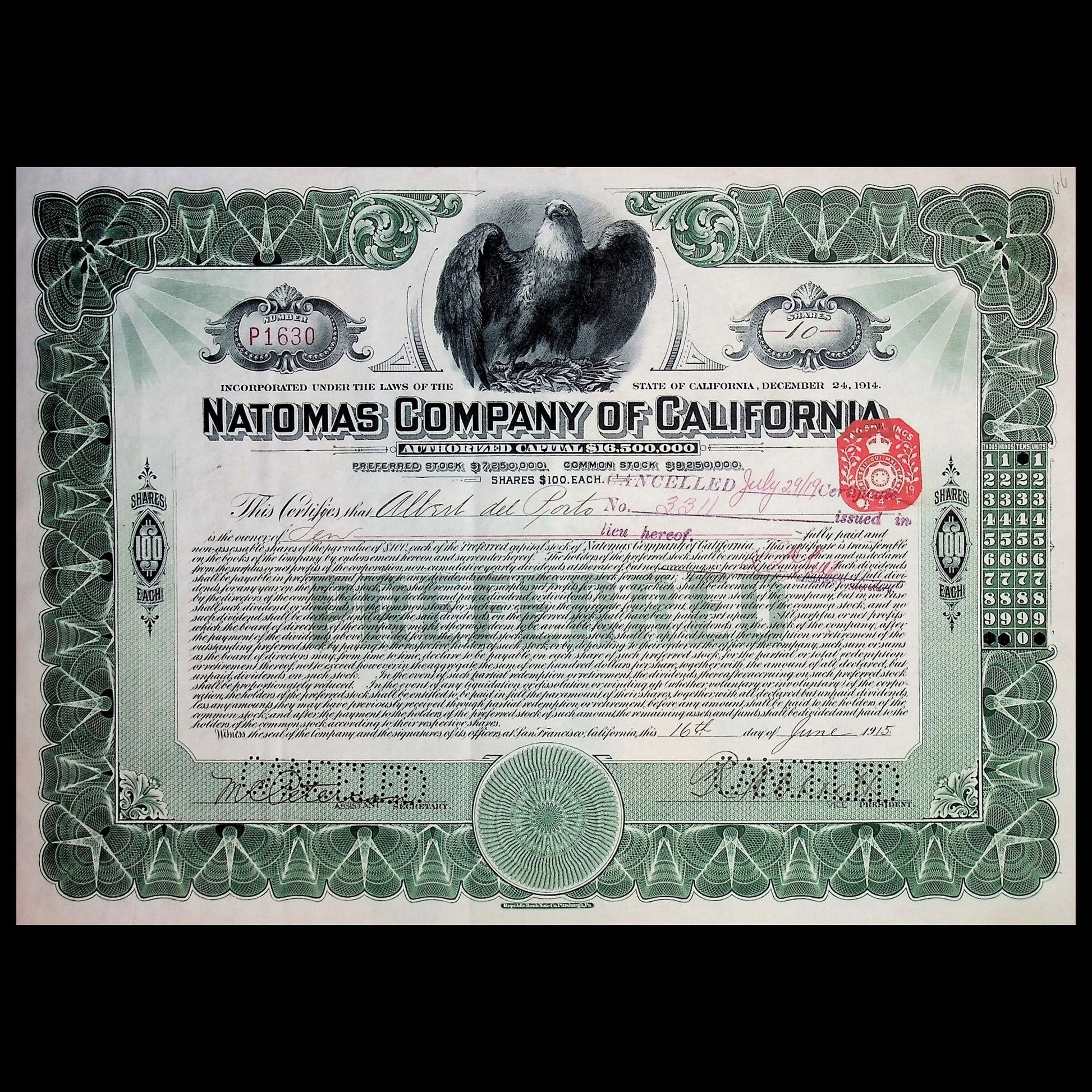Natomas Company of California Stock Certificate from 1915