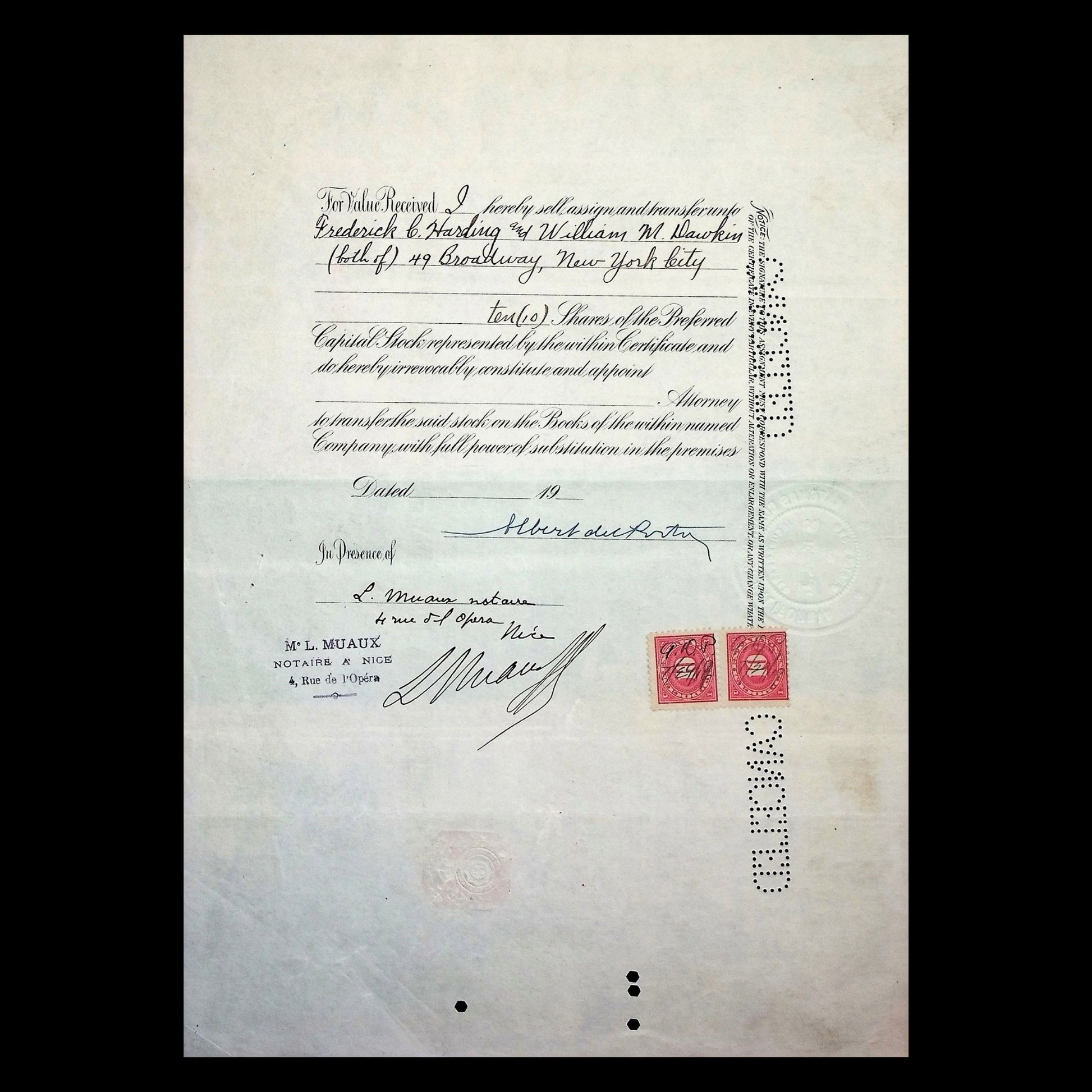 Paper quality: Stock certificates were printed on a variety of certificate paper dating back to the mid 1800s. Most of these vintage collectable certificates have signs of used & wear , cancellation holes, pencil / pen writing, stamps, staples, adhesives, slight rips, missing coupons and other features.