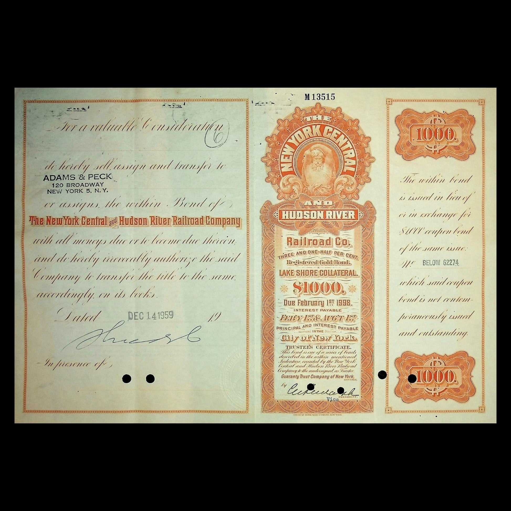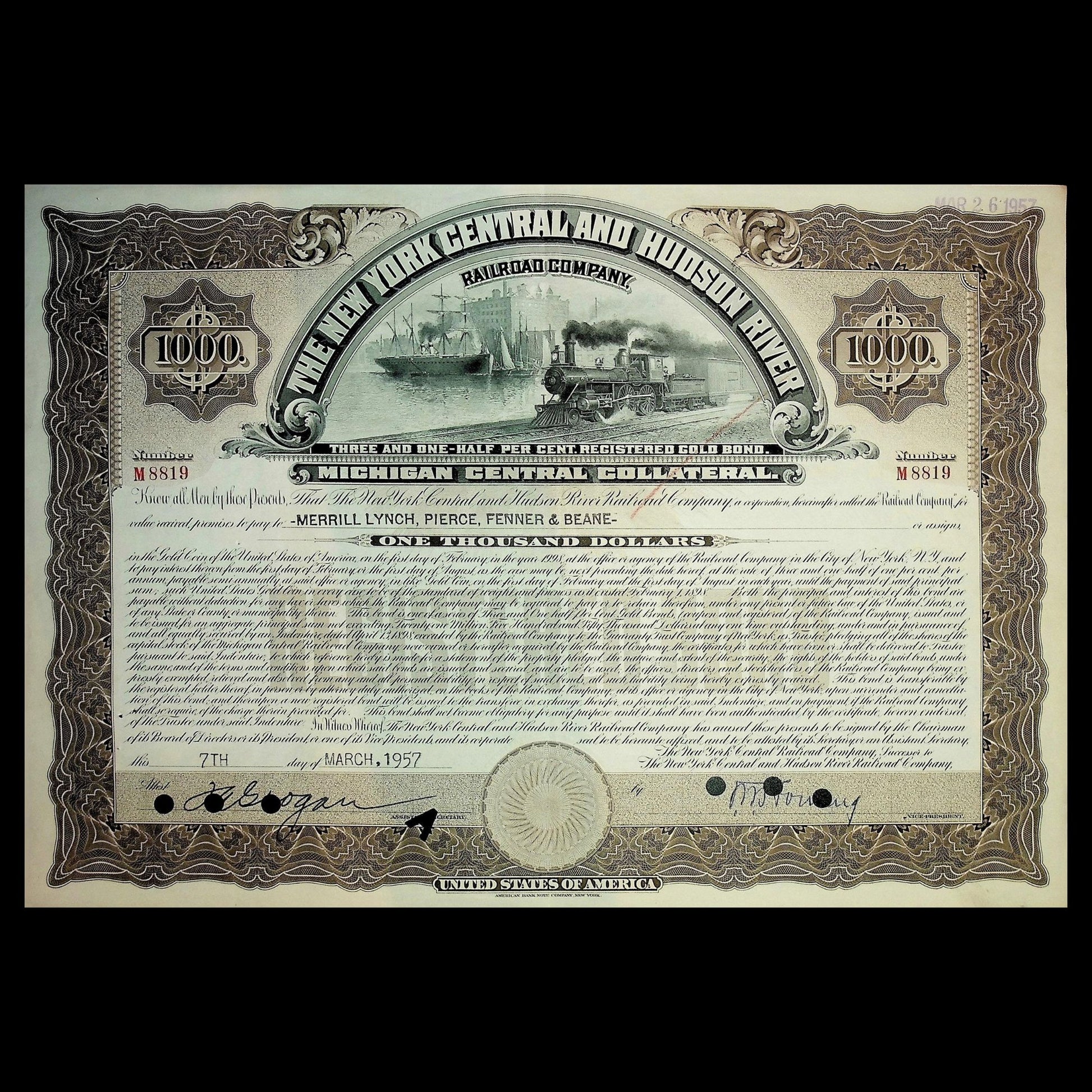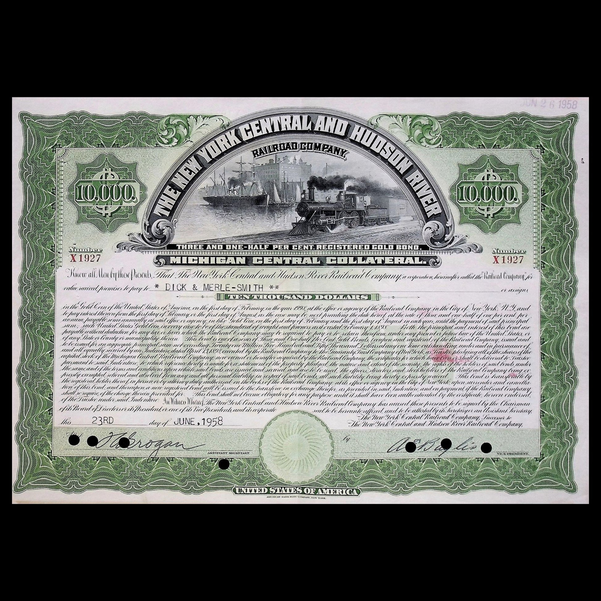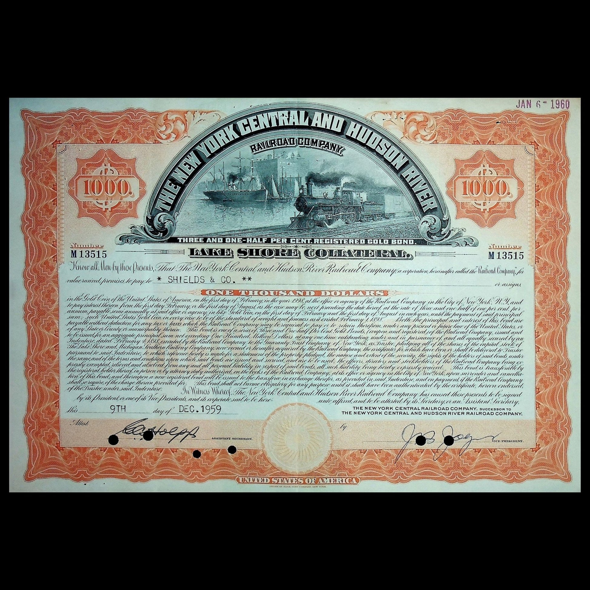 New York Central and Hudson River Railroad Company Bonds from 1950s (6 color options)