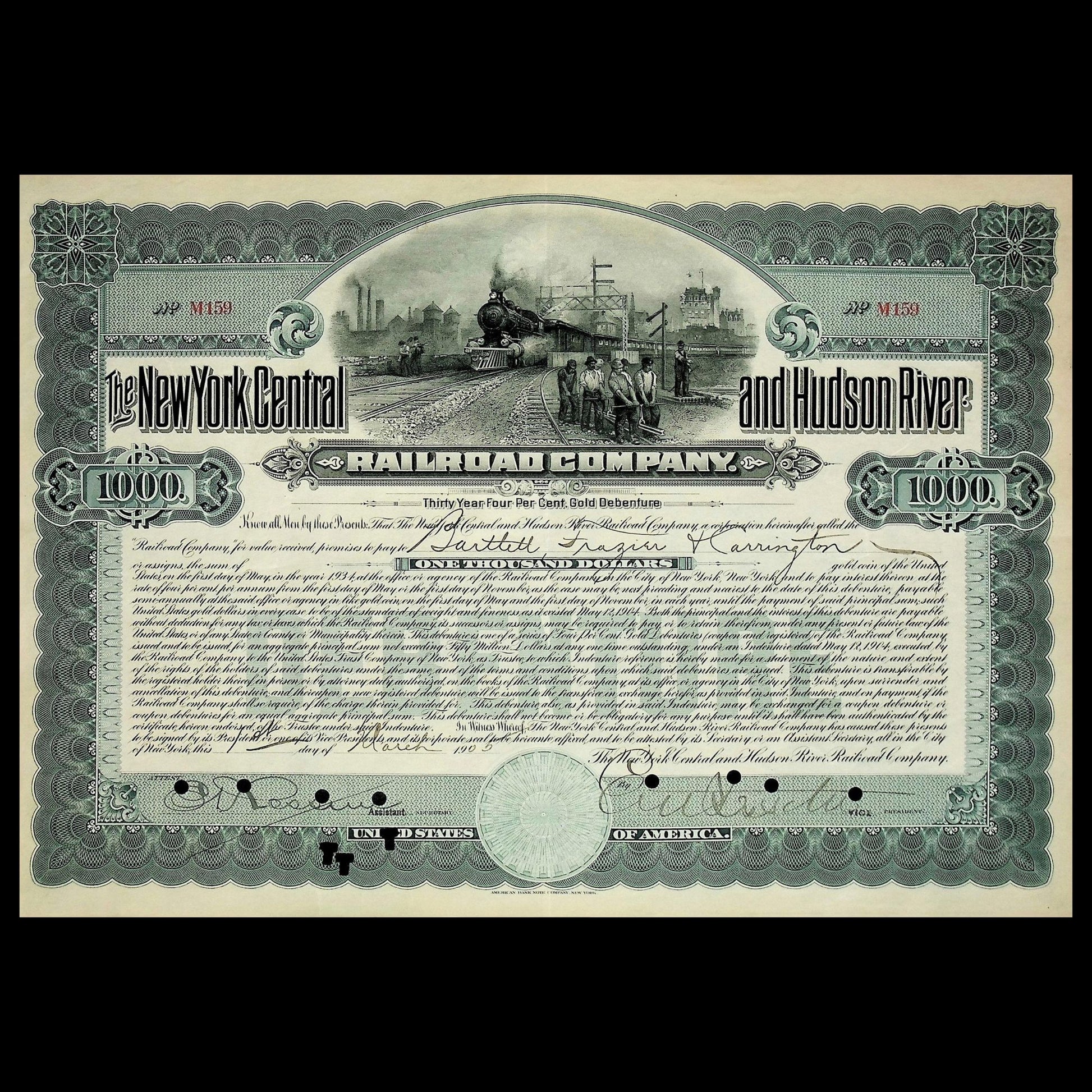 Your choice of 6 different colors of the New York Central and Hudson River Railroad Company bond certificates from the 1950s-1906s that have been issued and cancelled. Features a beautiful vignette of a steam train with NY harbor in the background. Perfect collectable for New York or railroad enthusiasts, great for framing.