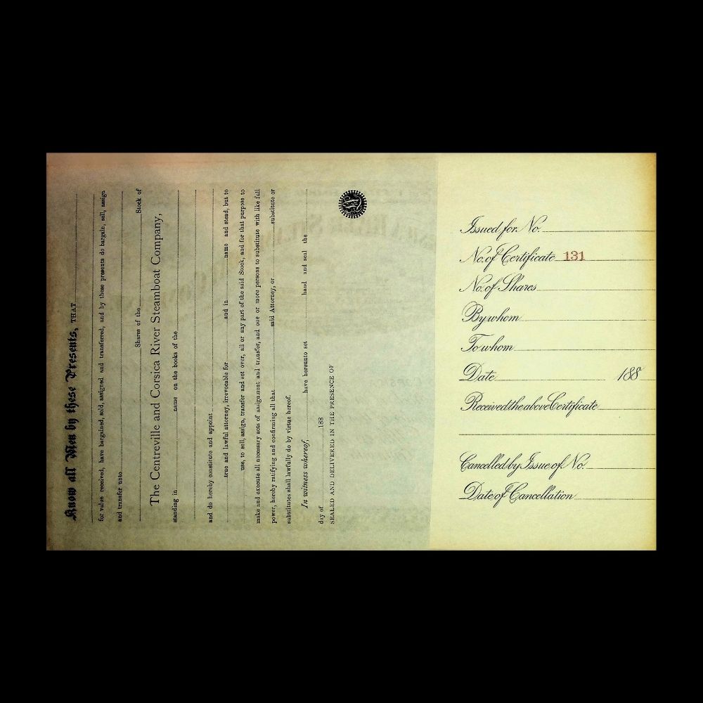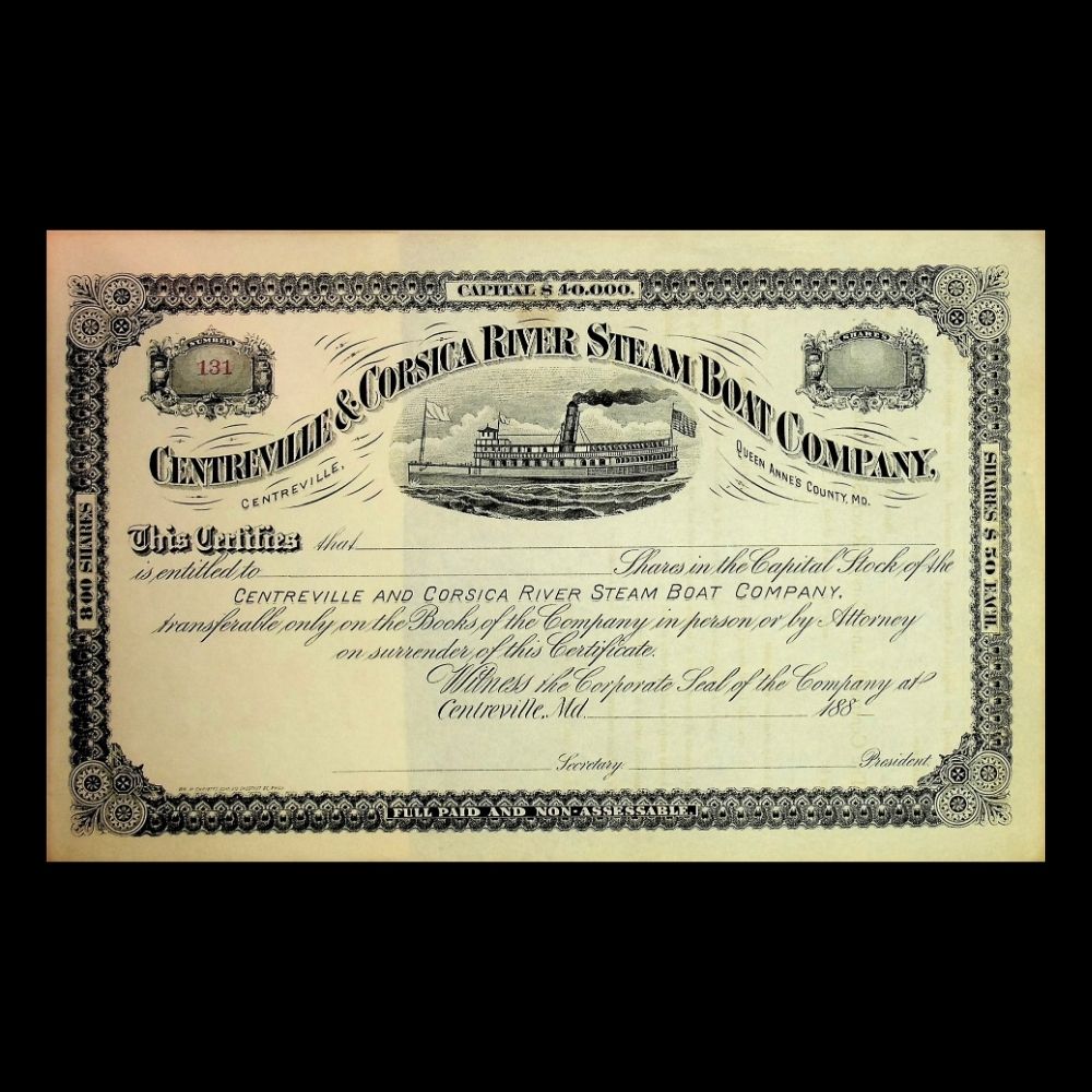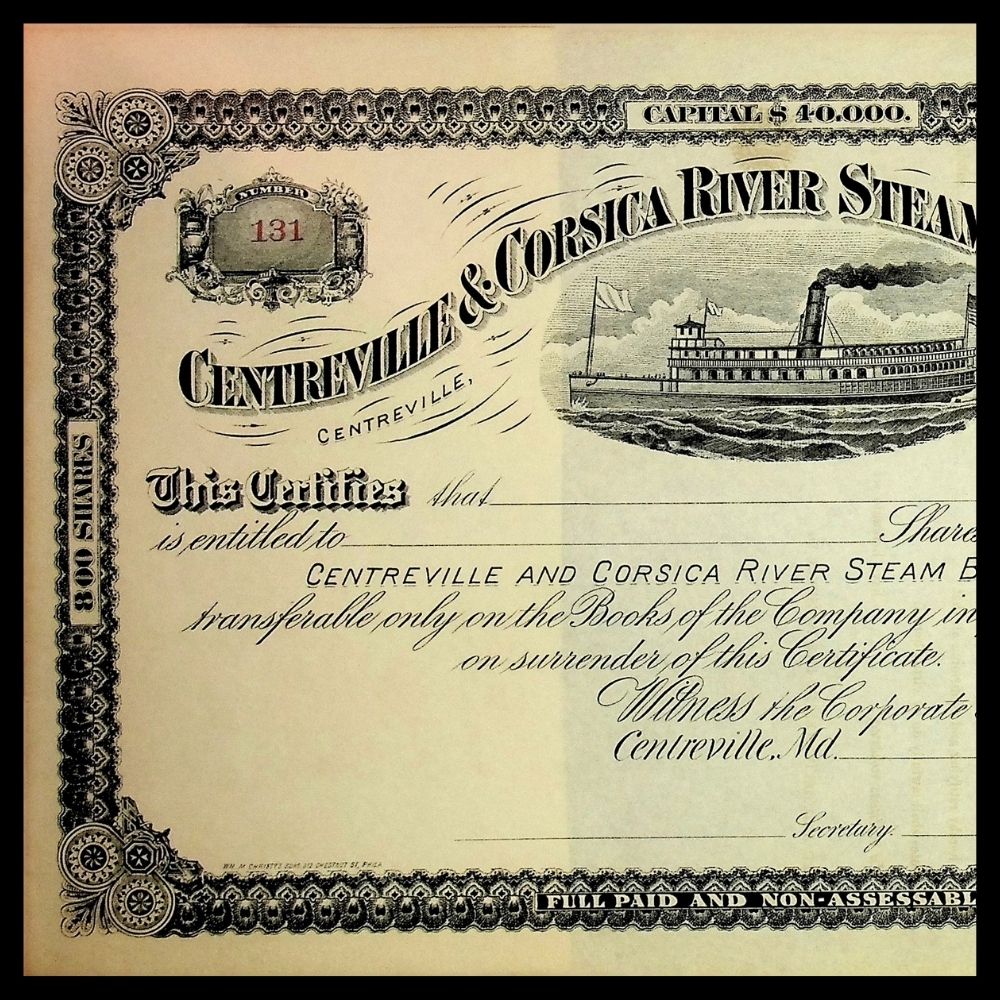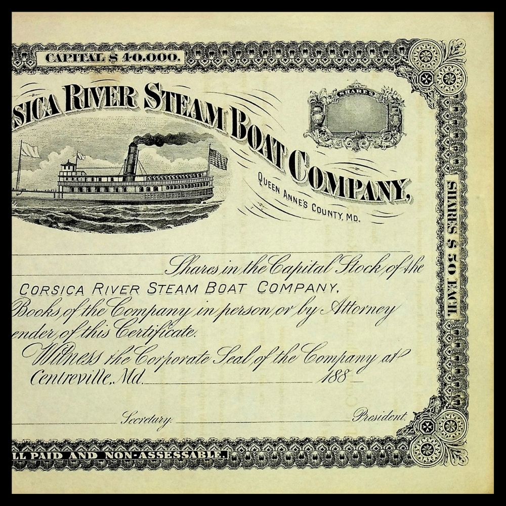 Centerville & Corsica River (Chesapeake Bay) Steam Boat Company Unissued Stock Certificate 1880s