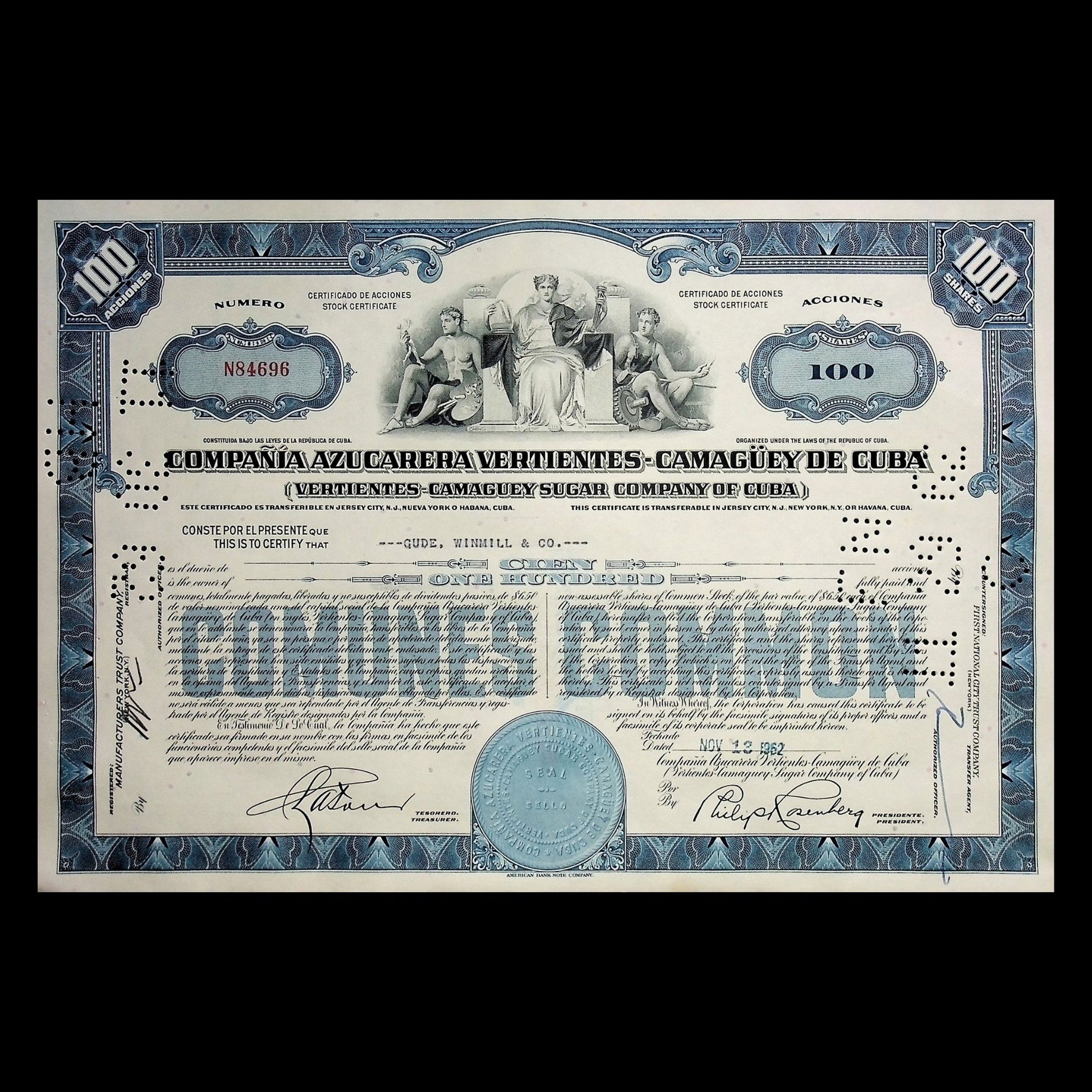 This is a blue stock certificate issued in the 1960s by the Compañía Azucarera Vertientes-Camagüey de Cuba, one of Cuba’s largest sugar producers. It was issued and later cancelled. Offered as a collectible.
