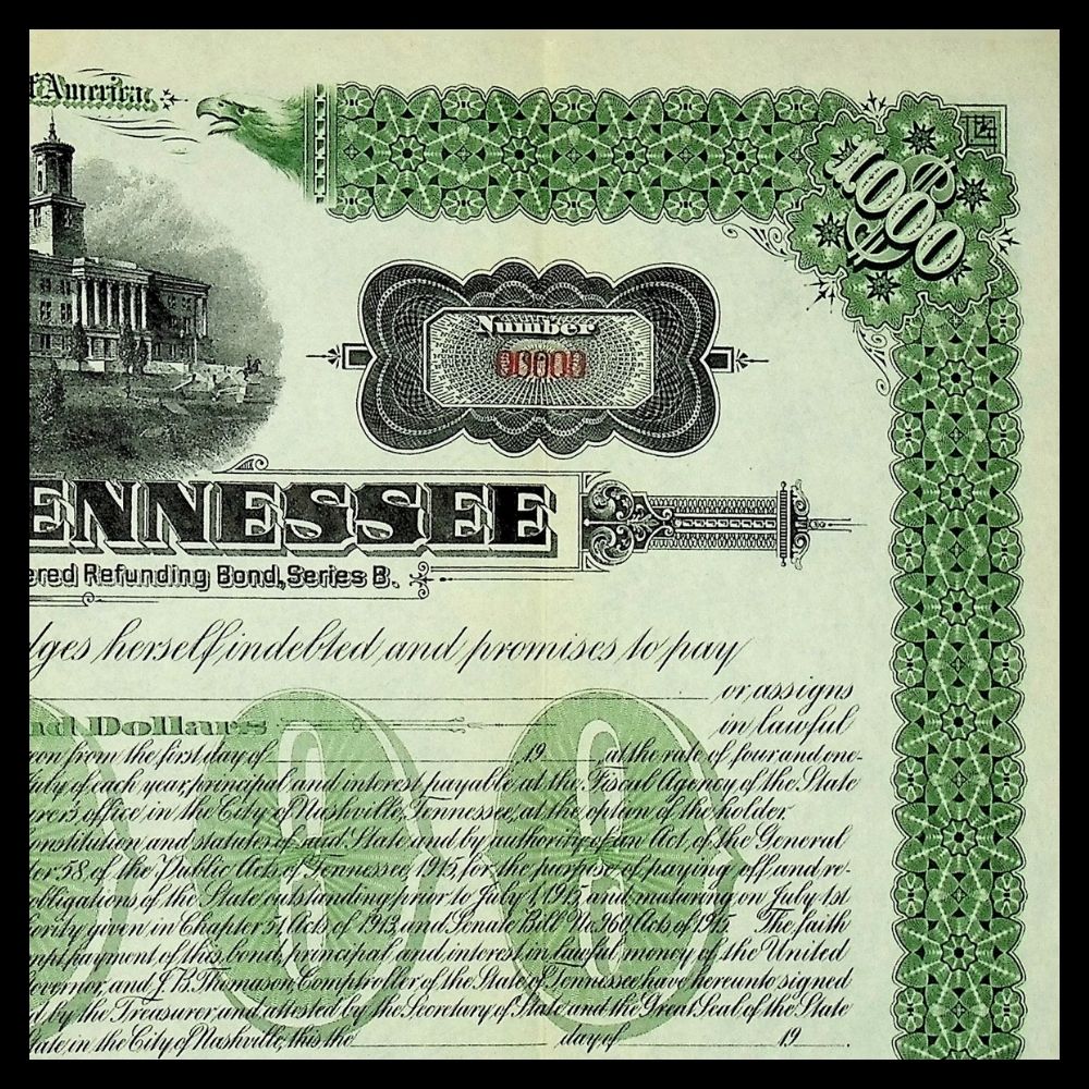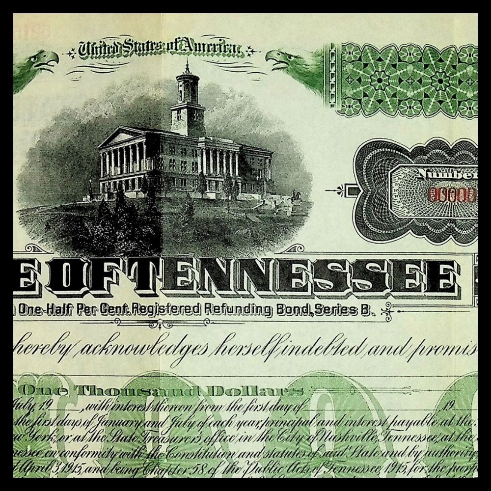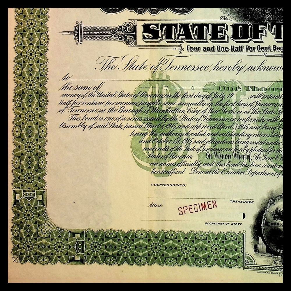 State of Tennessee Specimen Bond Certificate 1940s with State Capitol Building