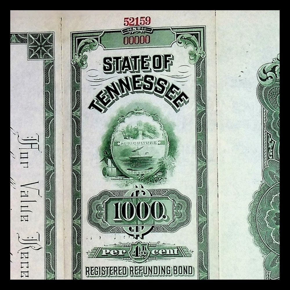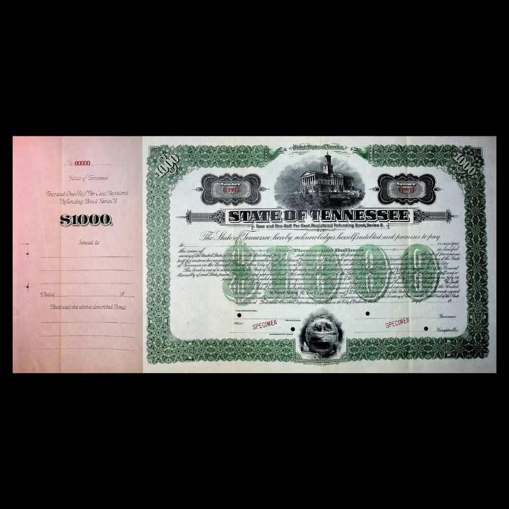This is a rare green specimen bond certificate issued by the State of Tennessee. Specimen notes like this were used by printers as samples, never issued to the public, and carry the word “Specimen” in red bold stamps, all zero 0000 serial numbers. Comes with the stock book attachment. Very rare piece. It was lightly folded, we ship flat. Offered as a collectible.