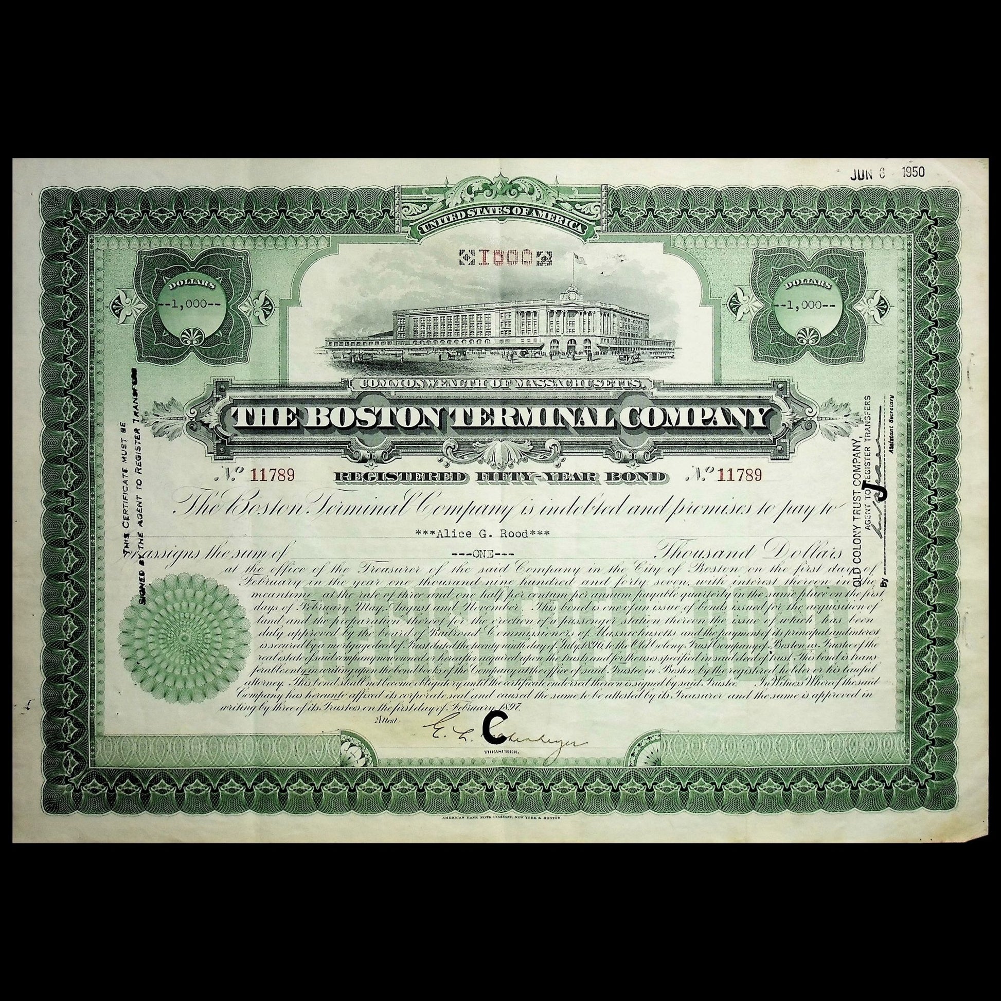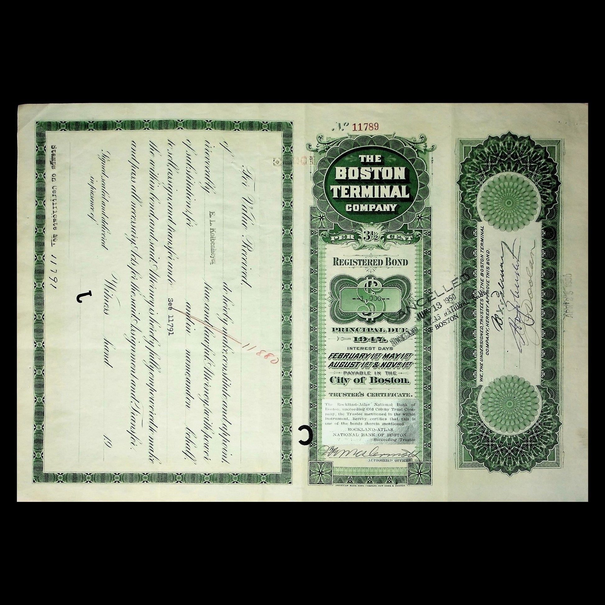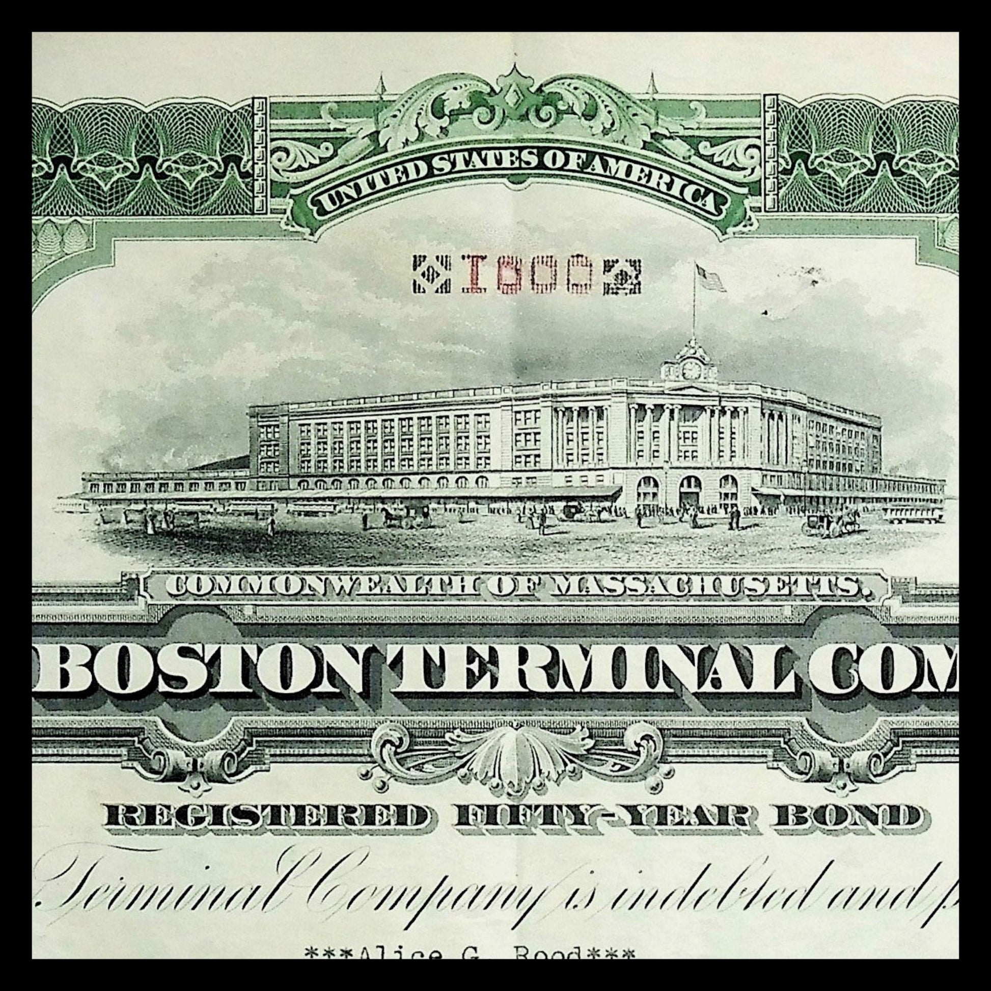 South Station opened in 1899 and remains an active rail hub, symbolizing Boston’s Golden Age of railroads. These bonds embody the massive infrastructure efforts of the era.