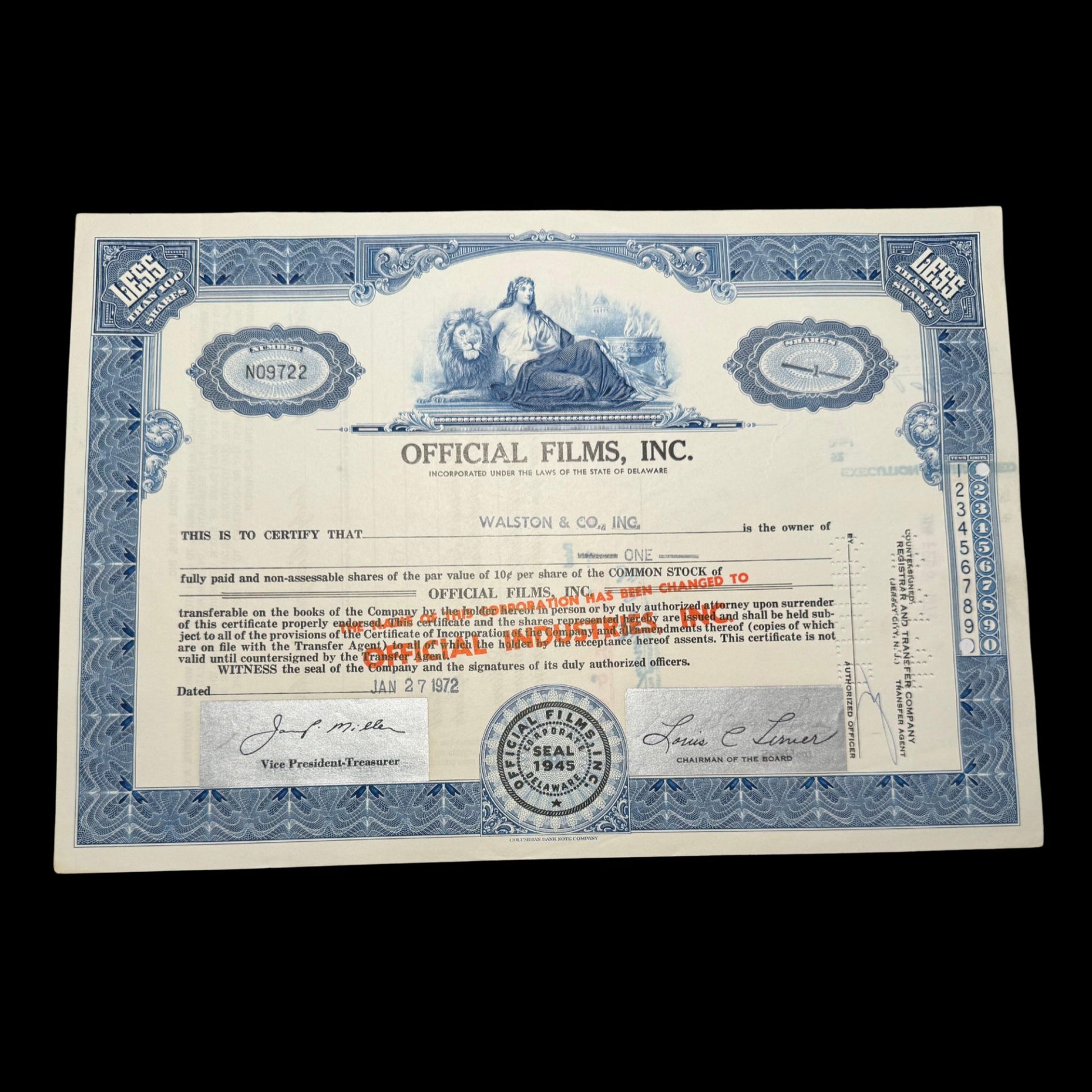 Official Films, Inc Stock Certificate (Film distributor) from 1972