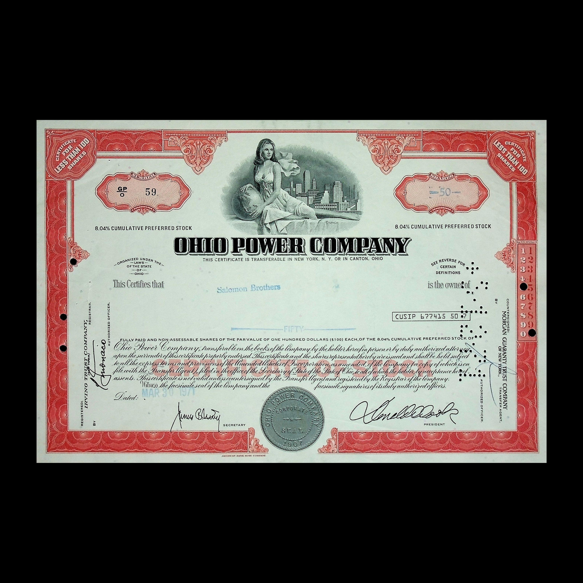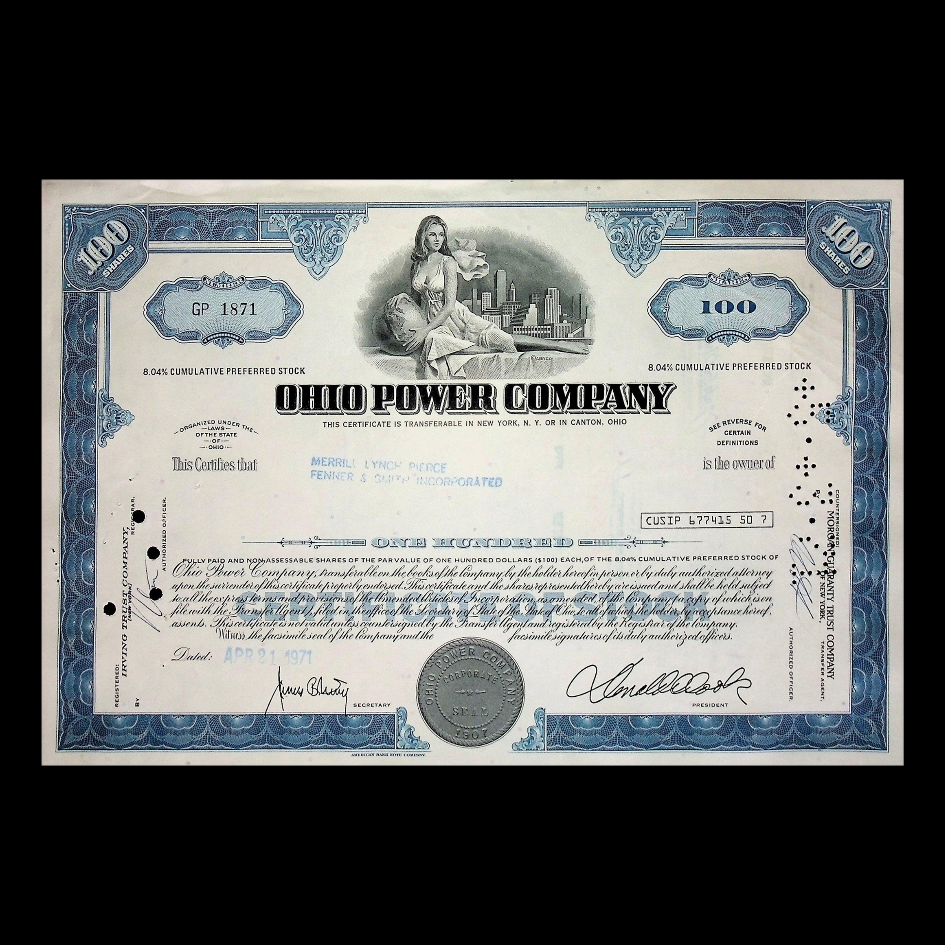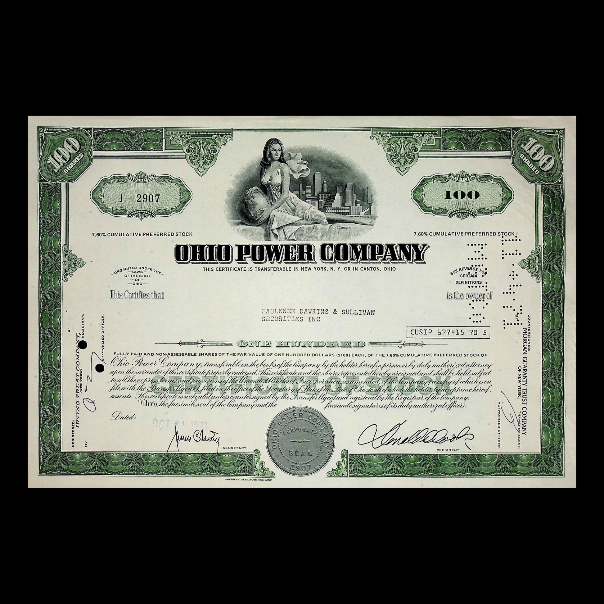 Your choice of 4 colors, this stock certificate from the Ohio Power Company, stamped in 1971, features cancellation holes, stamps, and handwritten annotations, indicating its authenticity and historical use.