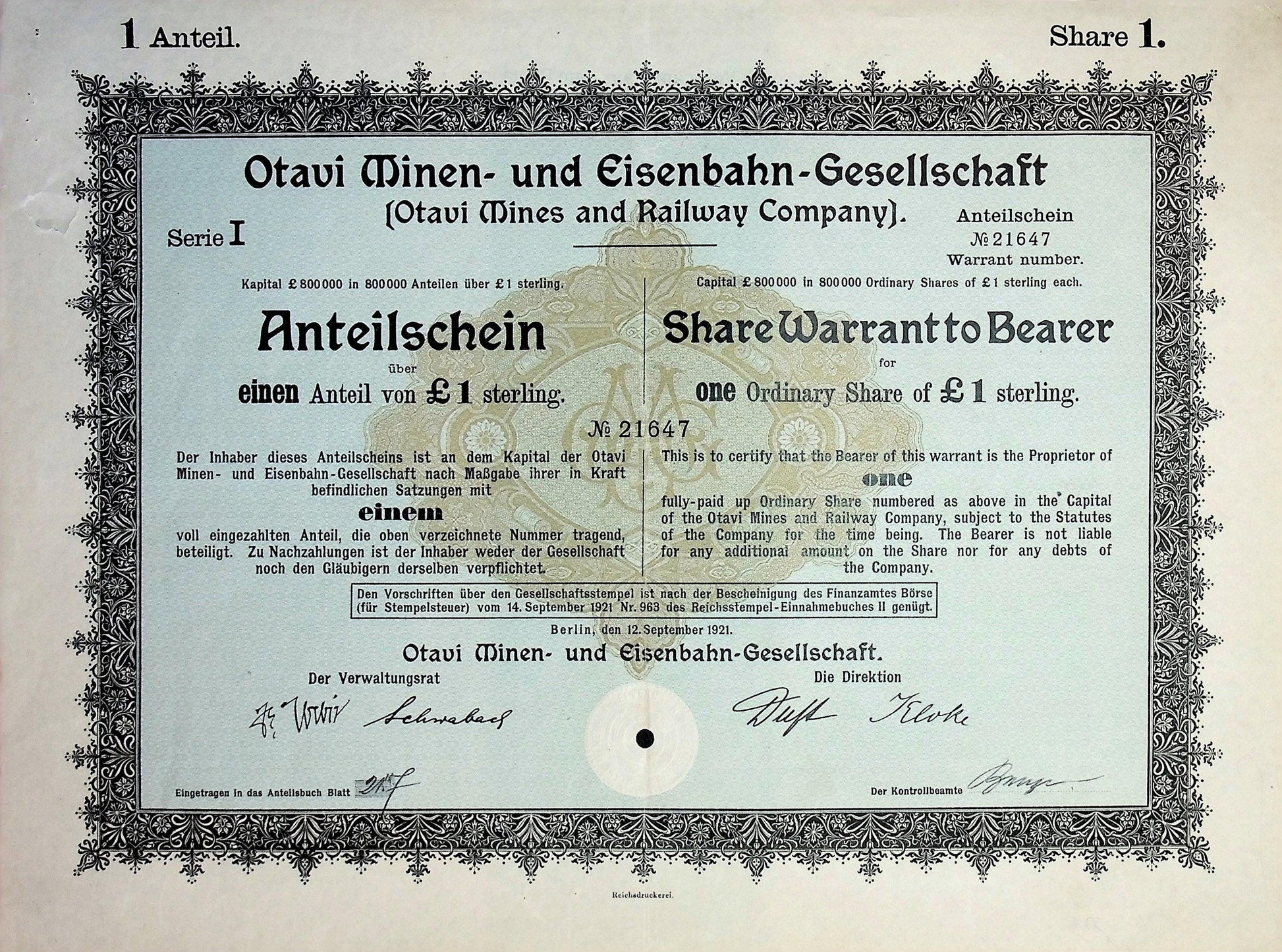 Otavi Mining and Railway Company Share Warrant Certificate from 1921 (English + German)