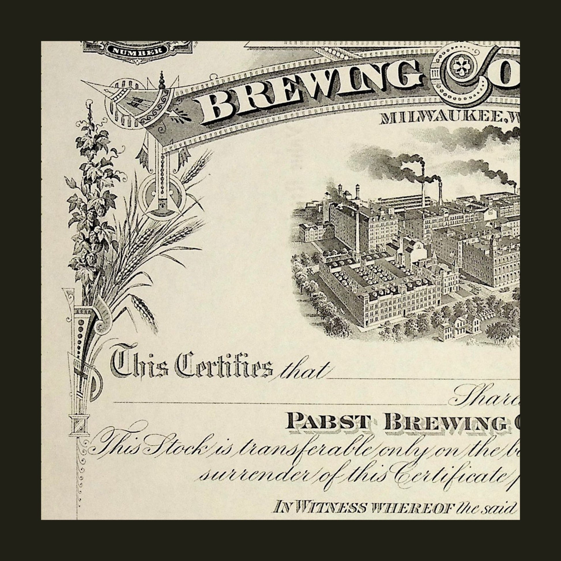 This is an unissued and uncanceled stock certificate from the Pabst Brewing Company, dating back to the early 1900s.The certificate features stunning early 20th-century typography, finely detailed engraving of the original Milwaukee brewery, and blank fields for shareholder and officer signatures. With no cancellation holes or marks, it remains in clean, unused condition offered as a collectable.
