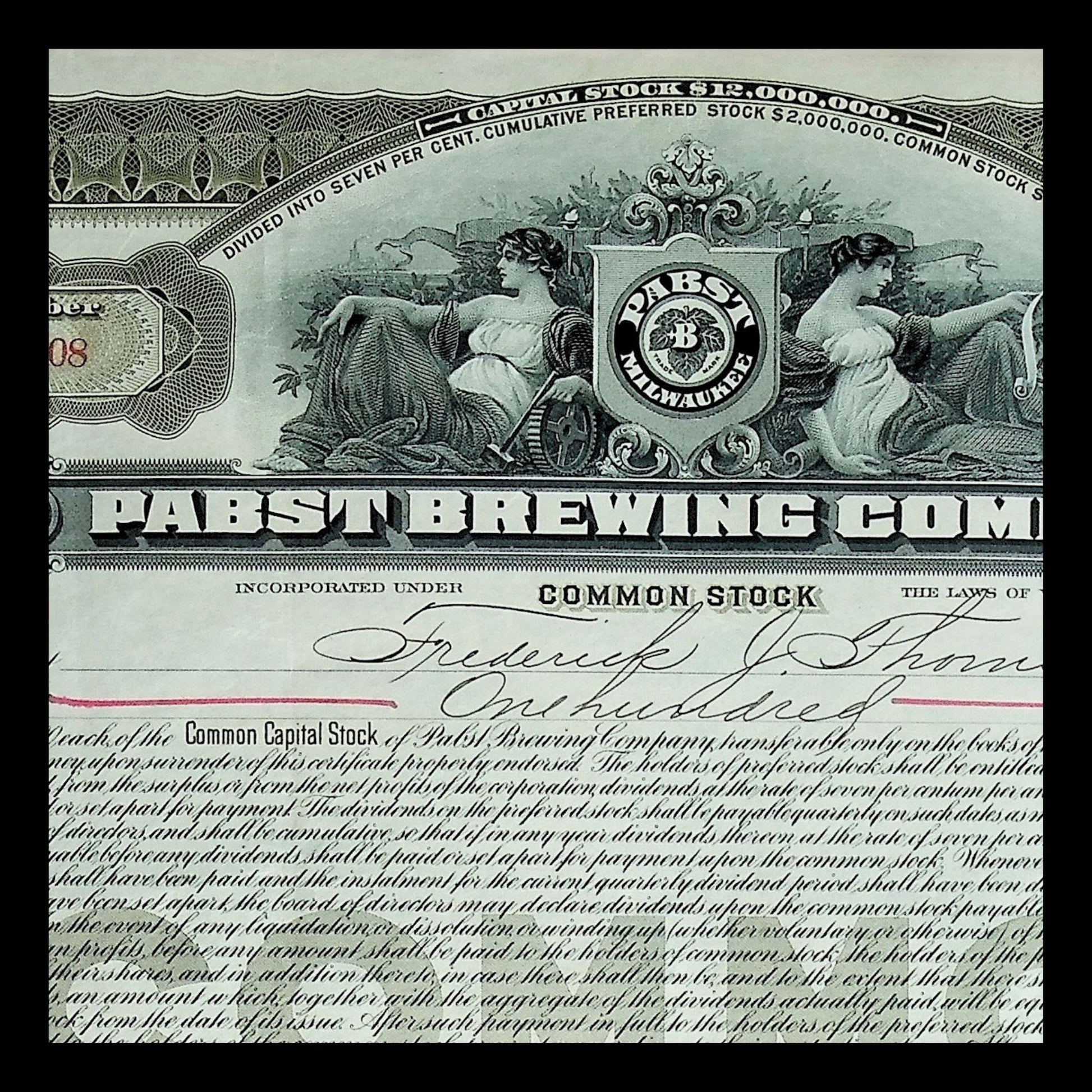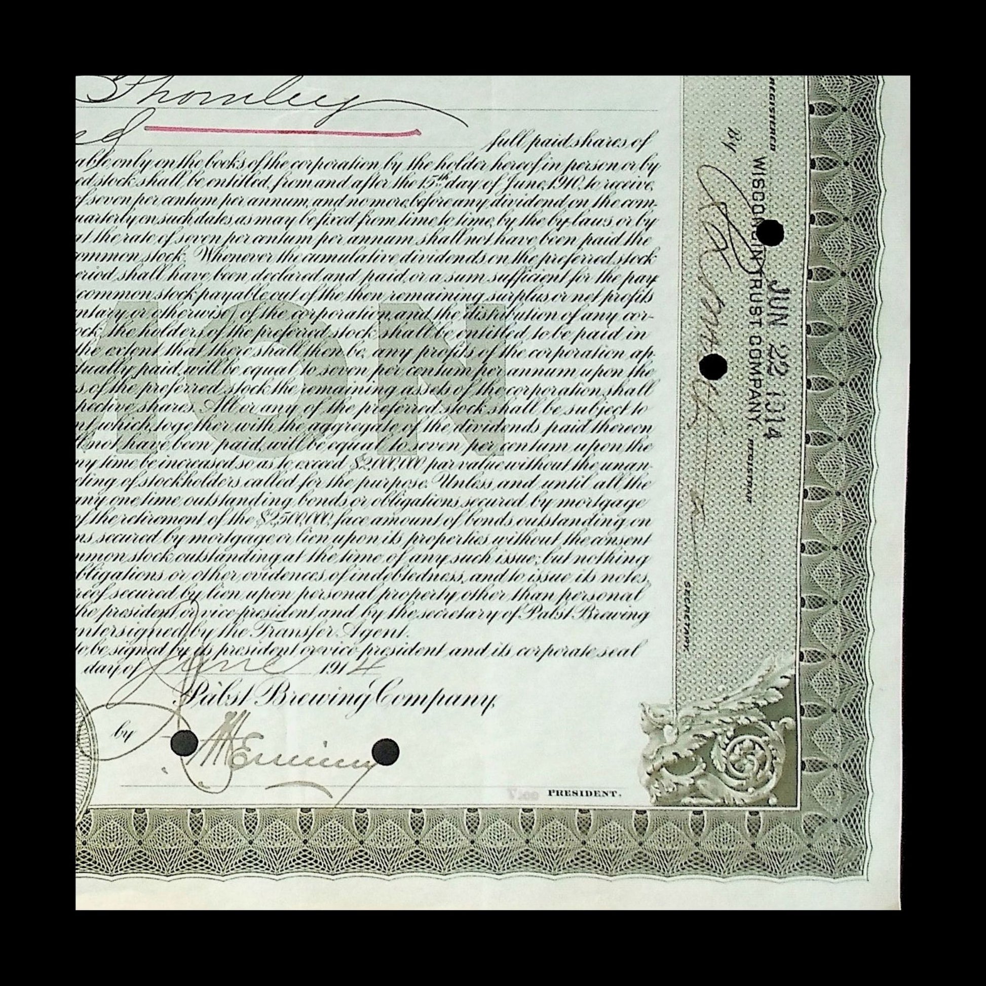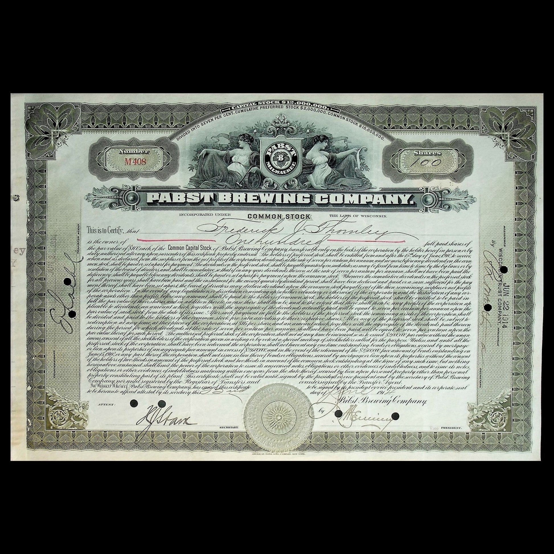 Pabst Brewing Company Stock Certificate from 1914