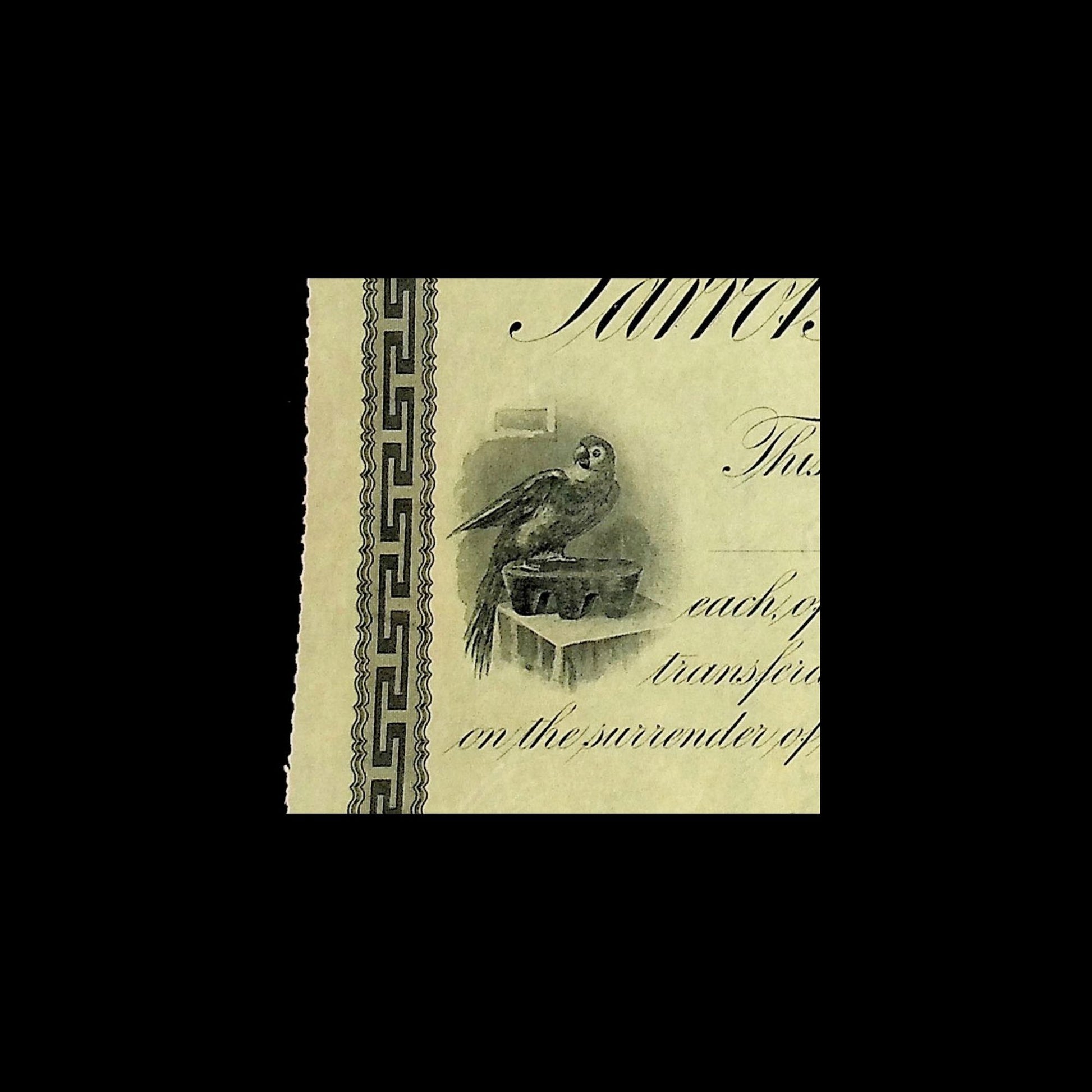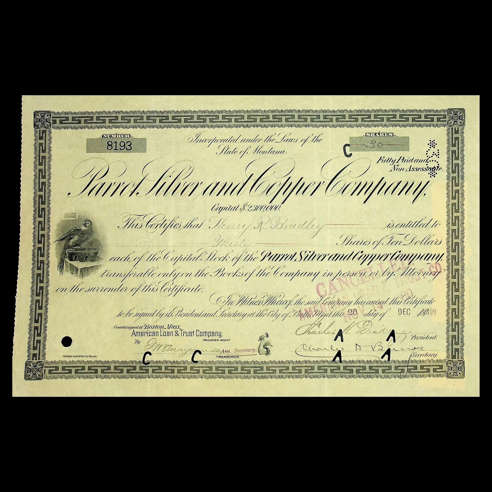 Parrot Silver and Copper Company Stock Certificate from 1899 (Montana) ft image of Parrot!
