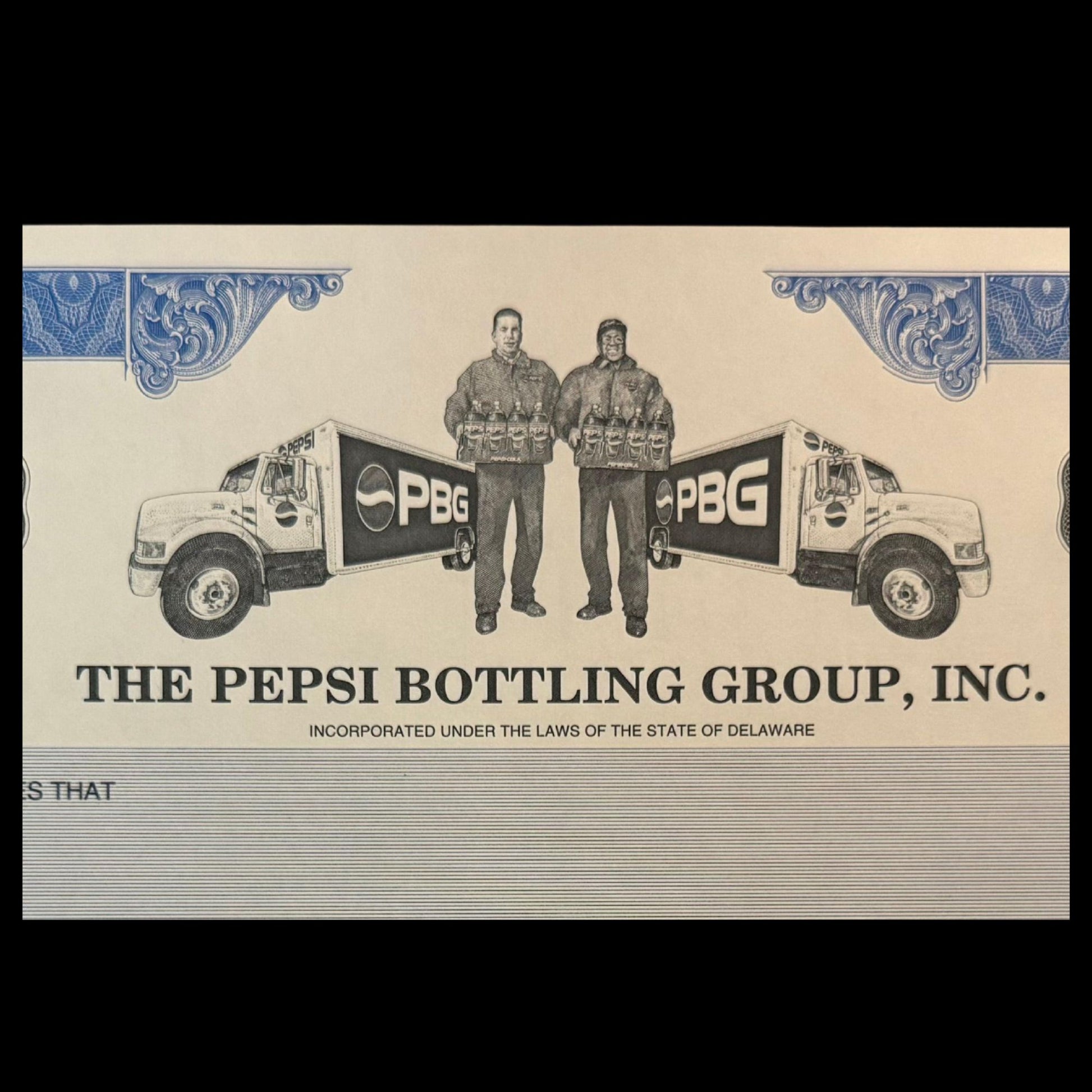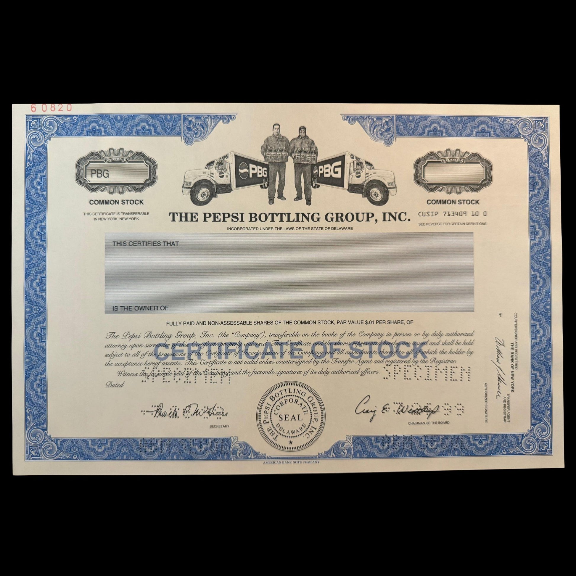 This is a blue, crisp specimen certificate, featuring vibrant vignette of Pepsi Bottling Group delivery trucks & drivers dated 1999. Very rare certificate. Unissued with cancellation holes present. Offered as a collectable.