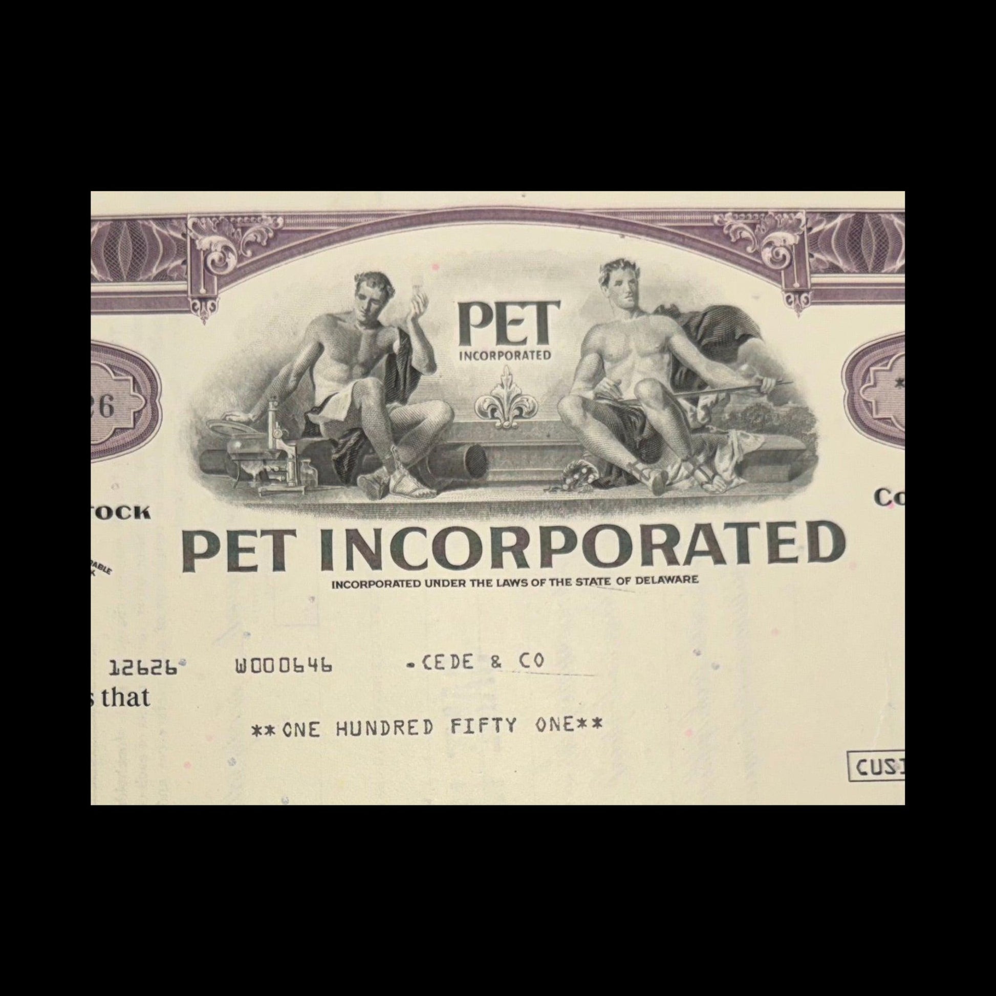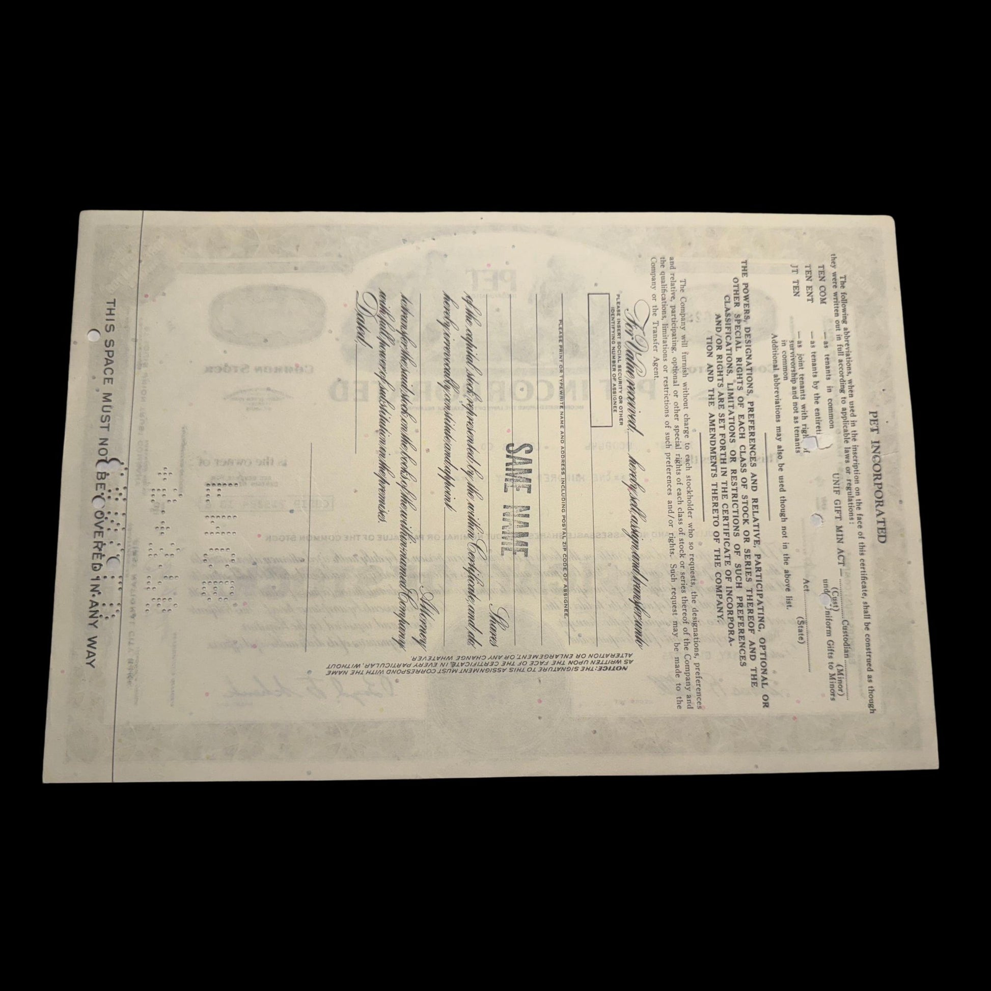Pet Evaporated Milk is now part of J.M. Smucker Company, while Pet Dairy has become part of Dean Foods. Most of PET's other brands have been incorporated into General Mills. This stock certificate, issued in the 1970s, reflects a period when PET Incorporated was a prominent name in the food production industry, providing essential dairy products to consumers across the United States.