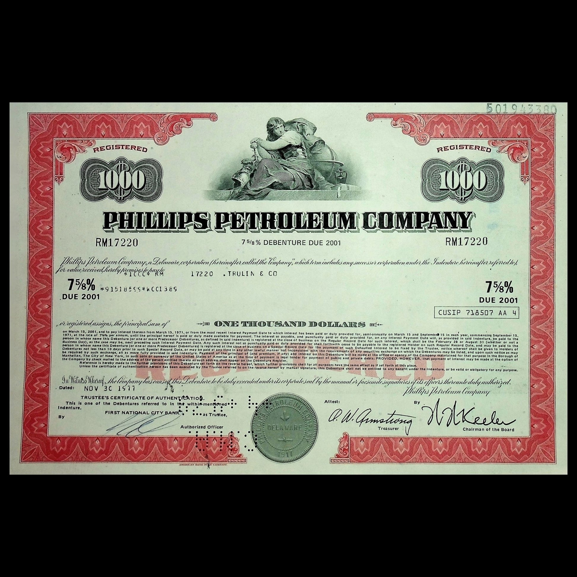 This authentic Phillips Petroleum Company bond certificate from 1970s is a collectible printed in red. Issued and cancelled. Once issued to investors, it represented corporate debt for one of America’s most important energy companies.