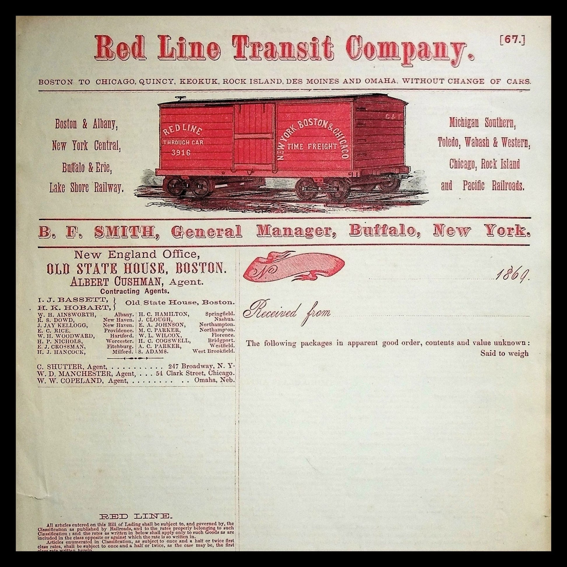 The Red Line Transit Company operated as part of a regional passenger and freight service that connected with major railroads including the Boston & Albany Railroad, New York Central, and other regional lines. These connections helped bridge last-mile transit needs—delivering goods, express packages, and passengers between rail terminals and urban destinations. The receipt represents how supporting systems like Red Line Transit played a vital role in completing the logistics networks of the Gilded Age.