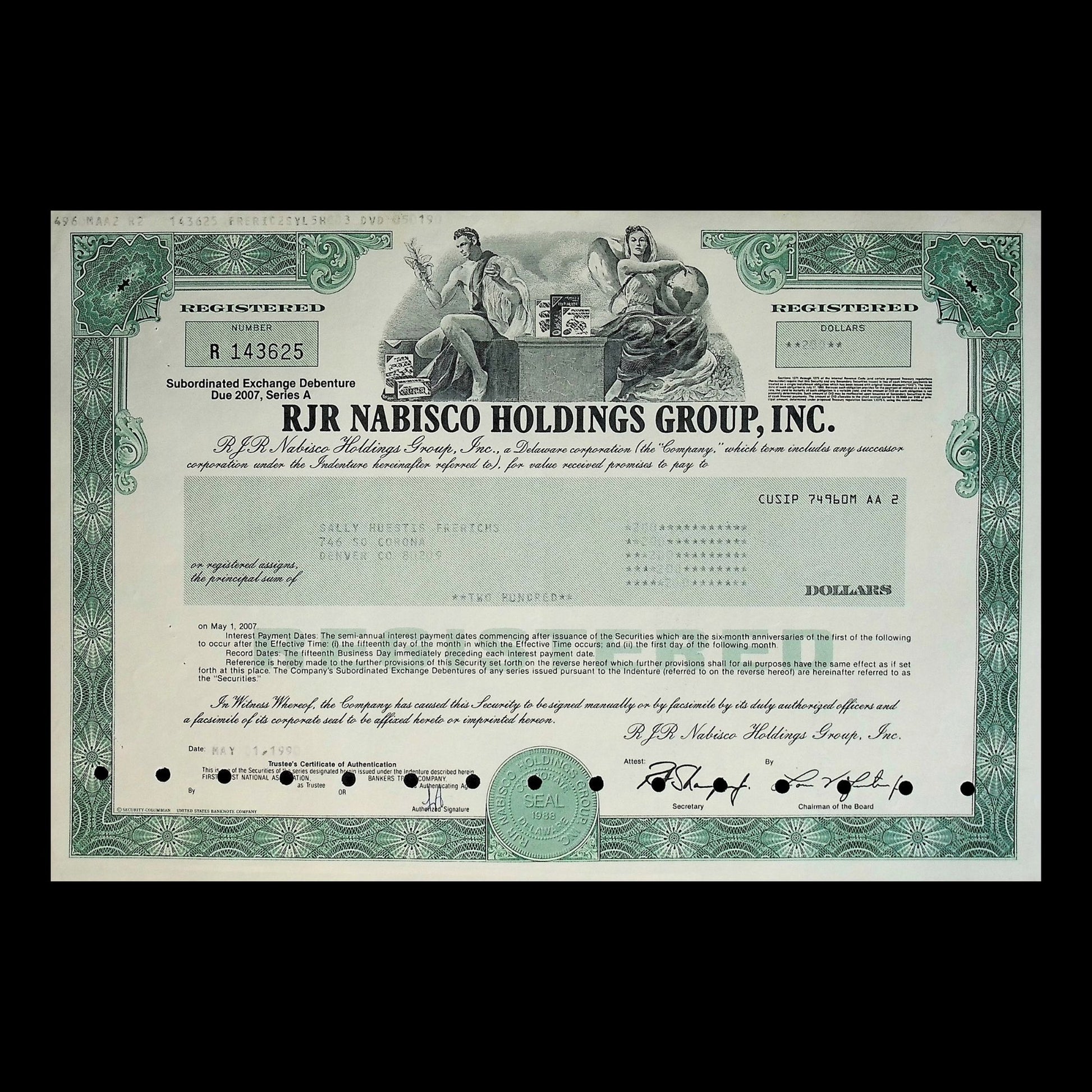 This green stock certificate from RJR Holdings Group, Inc., issued the 1980s-1990s, features products from Nabisco on the vignette. Offered as a collectable.