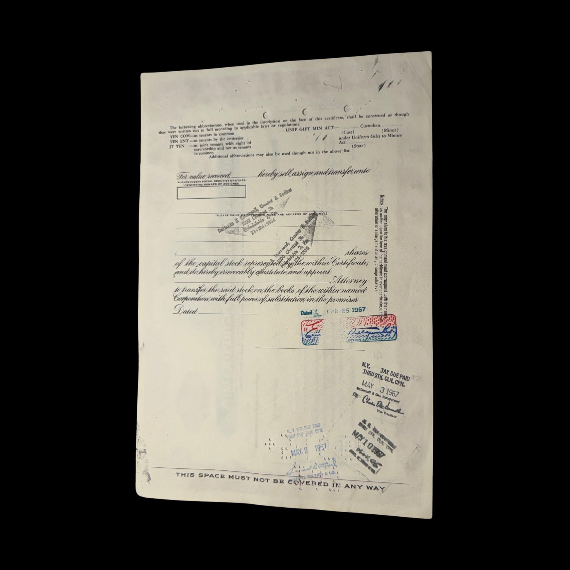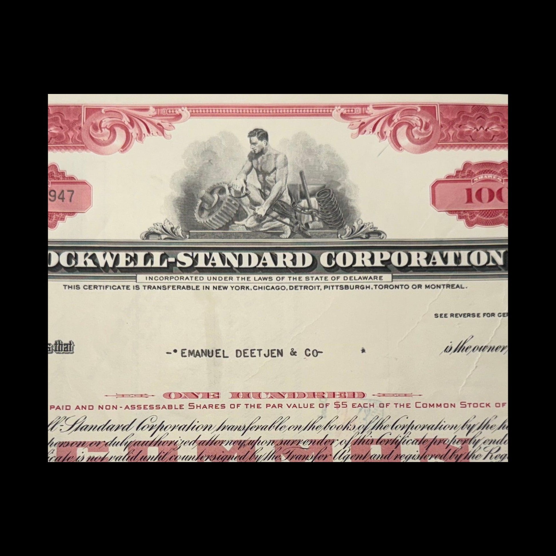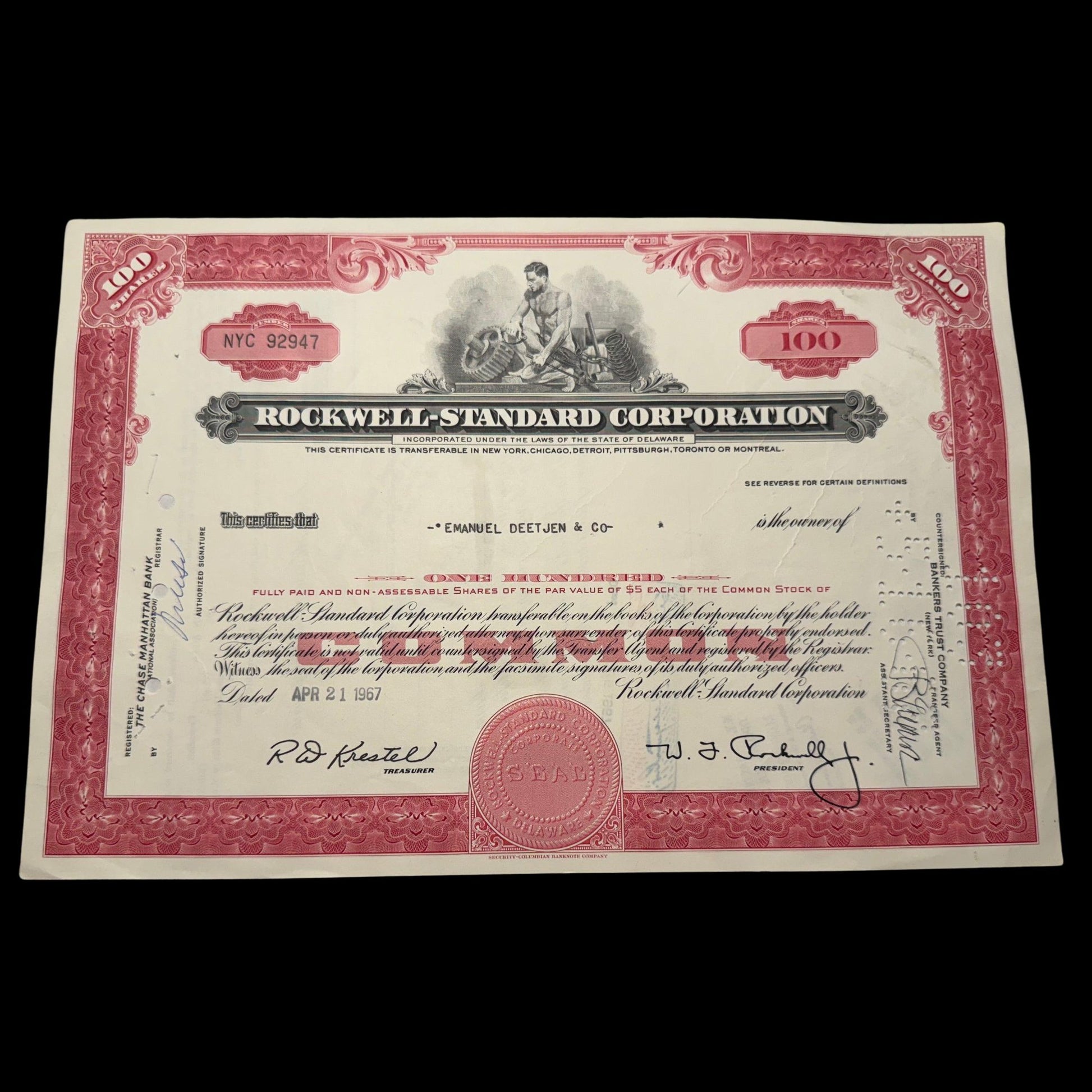 In 1967, the year this certificate was issued, Rockwell-Standard merged with North American Aviation, resulting in the formation of North American Rockwell. This merger further diversified the company's operations, extending its reach into aerospace, electronics, and automation sectors. By 1973, the company evolved into Rockwell International, which was later sold off to Boeing, BTR, Collins Aerospace and others.
