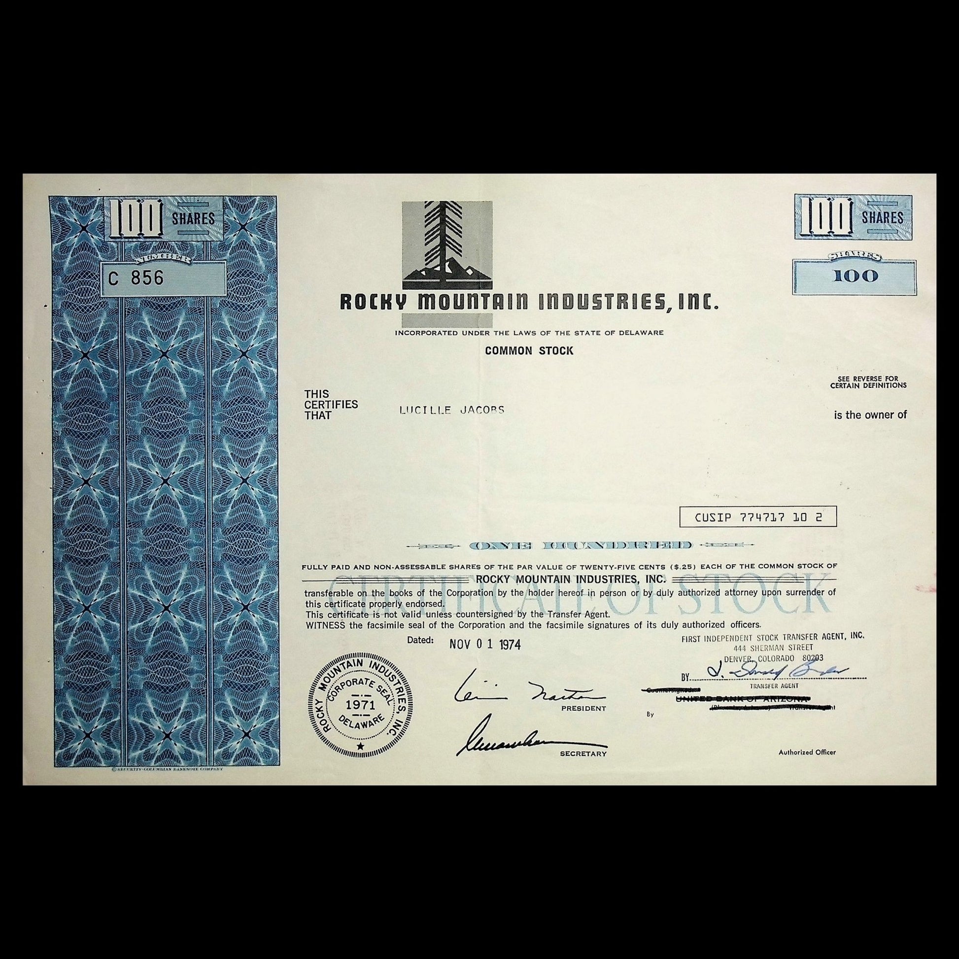 This is a blue stock certificate from Rocky Mountain Industries, issued in the 1970s. It was issued and later cancelled, offered now as a collectible.