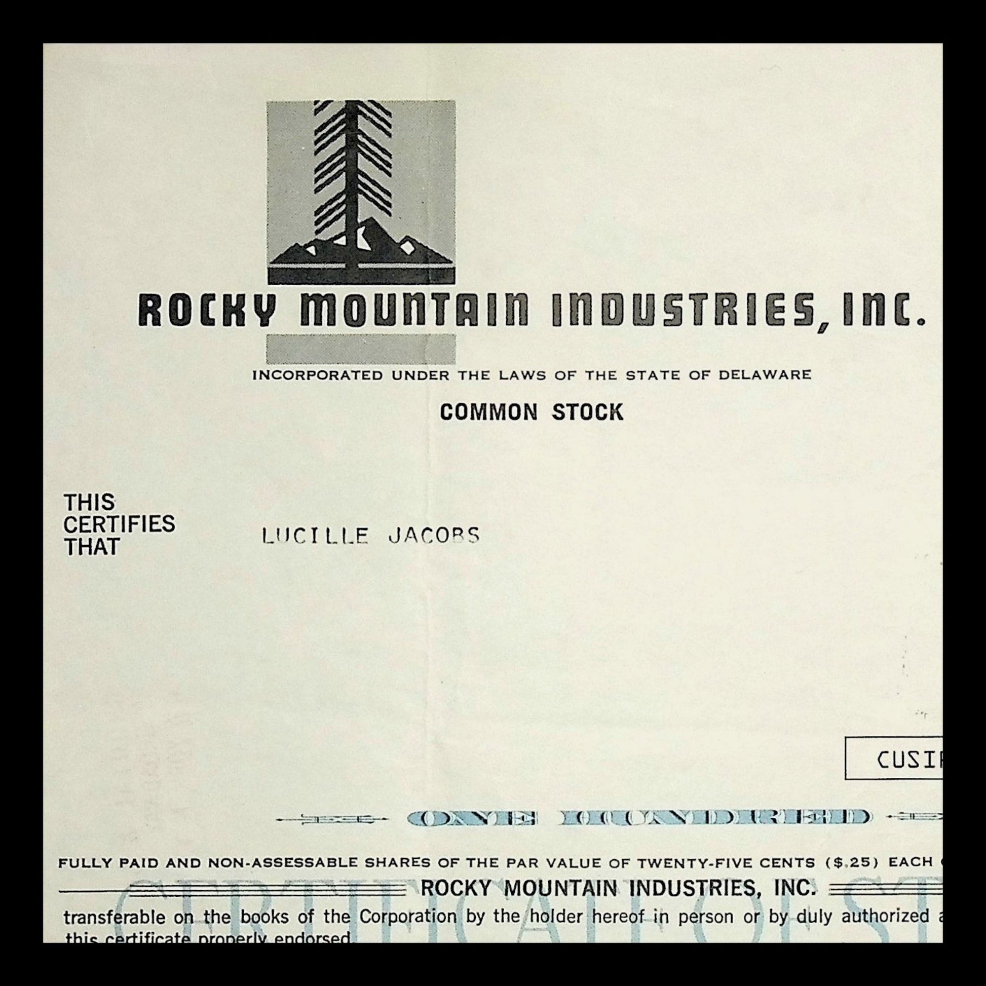 Rocky Mountain Industries (Colorado) Stock Certificate 1970s