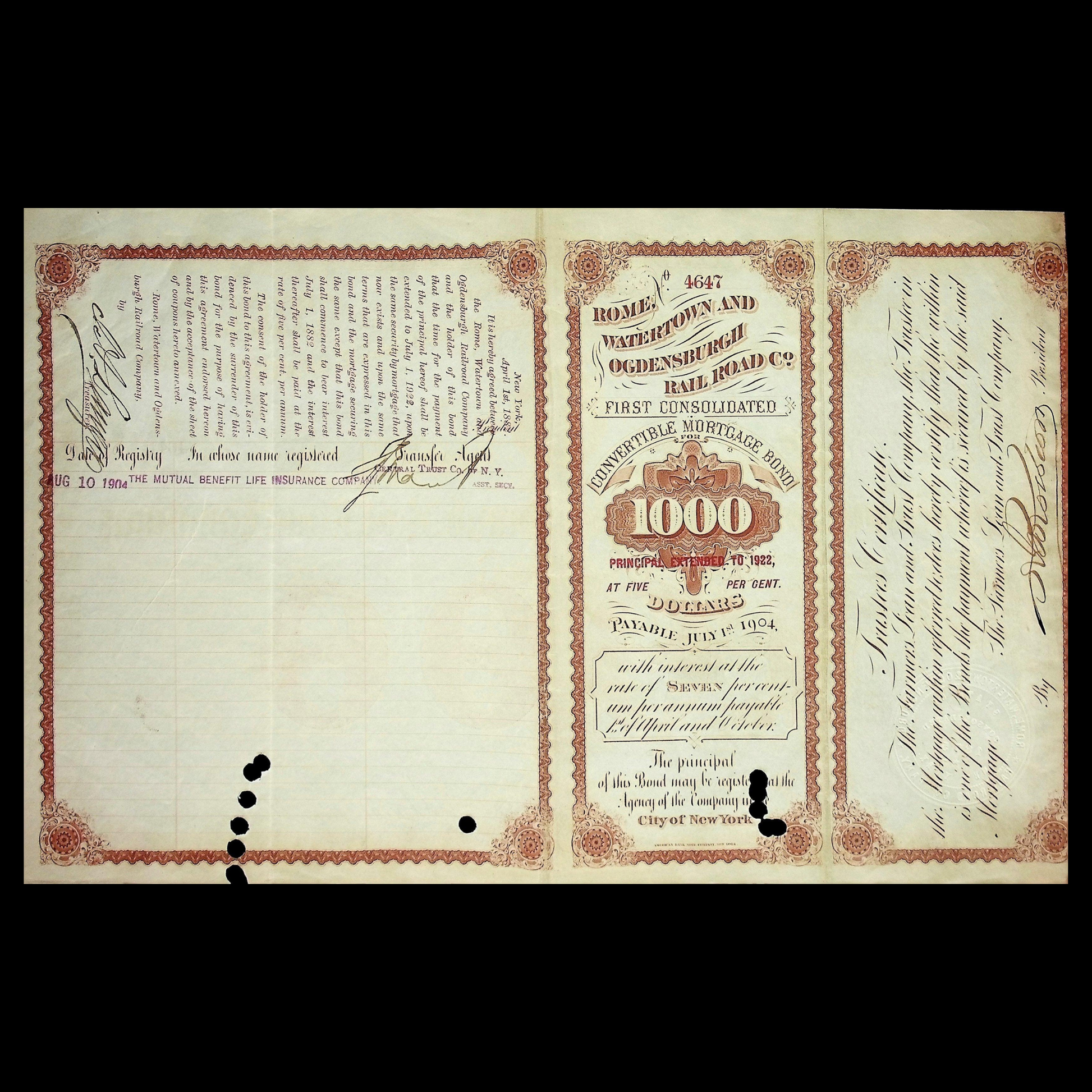 This is a bond certificate from the Rome, Watertown and Ogdensburg Railroad from 1904 which was located Niagara Falls, NY. It has been cancelled.