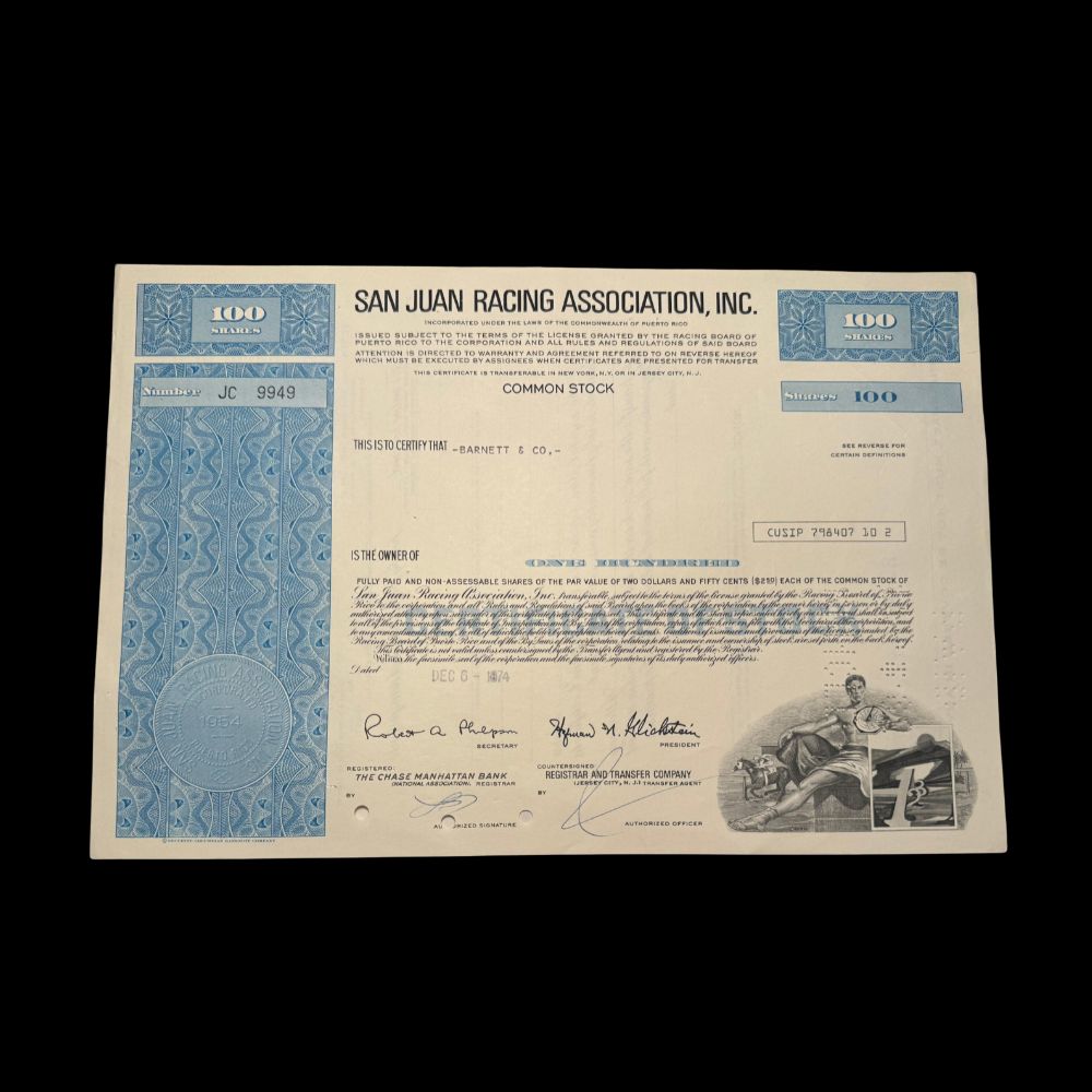 This blue stock certificate from San Juan Racing Association, Inc., issued in 1970s, features a vignette of a jockey on a horse. The certificate includes cancellation holes, stamps, and handwriting, indicating its authenticity and historical use.