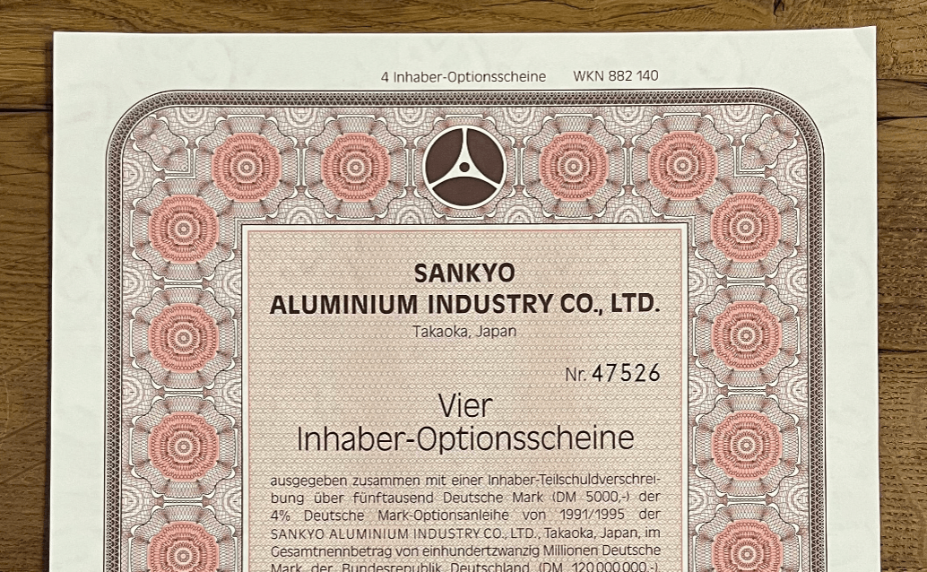 International warrant certificate from Sankyo Aluminum Industry, based in Takaoka, Japan, a city known for its metalworking heritage, Sankyo Aluminum Industry was a significant player in Japan's industrial aluminum sector.