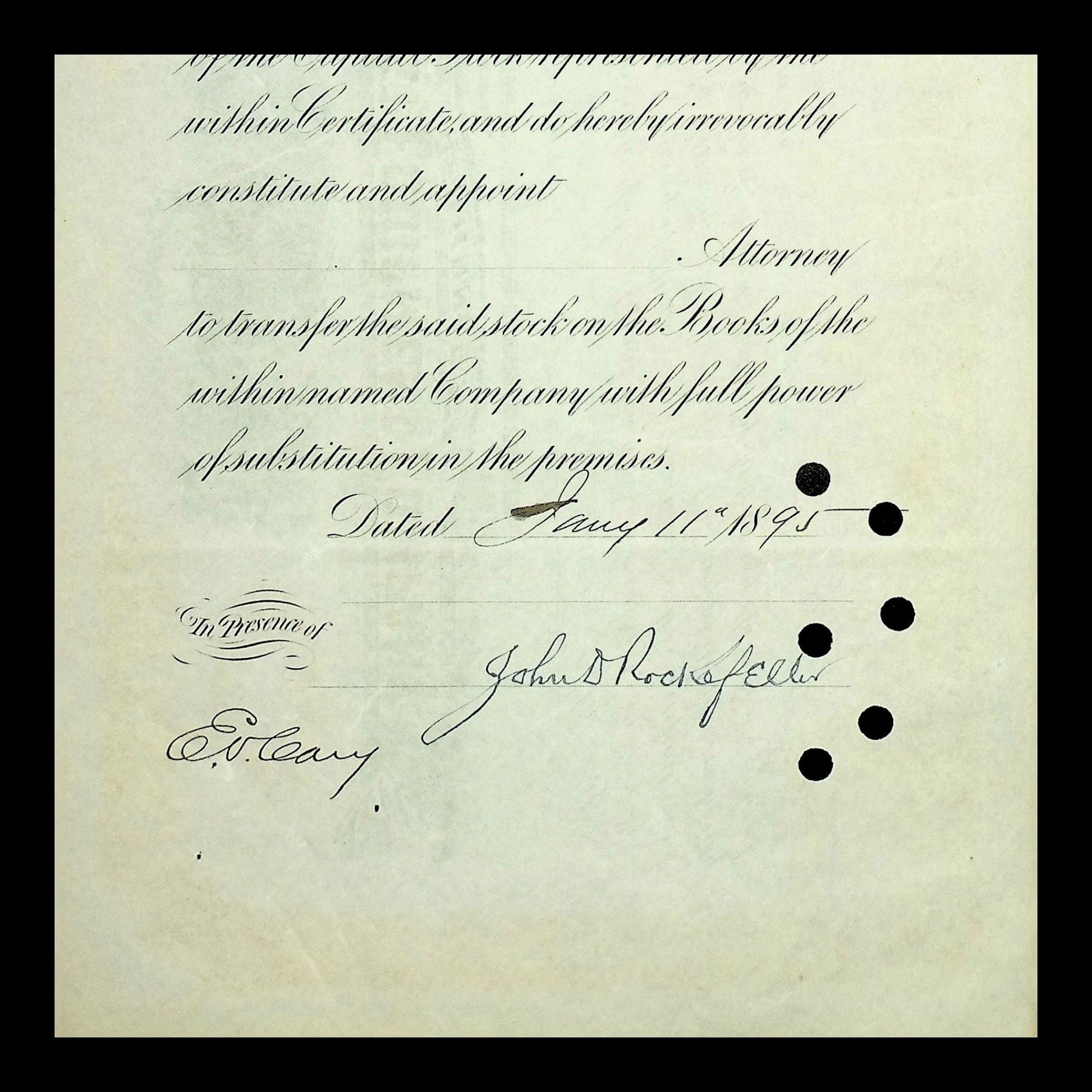 What makes this truly extraordinary is the shareholder: the certificate is issued to John D. Rockefeller, one of the most influential figures in American history. Rockefeller, founder of Standard Oil, was the world’s first billionaire and a dominant force in U.S. industry, finance, and philanthropy. His involvement in this company highlights how capital from oil fortunes was frequently reinvested into infrastructure, railroads, and equipment ventures during the late 19th century.