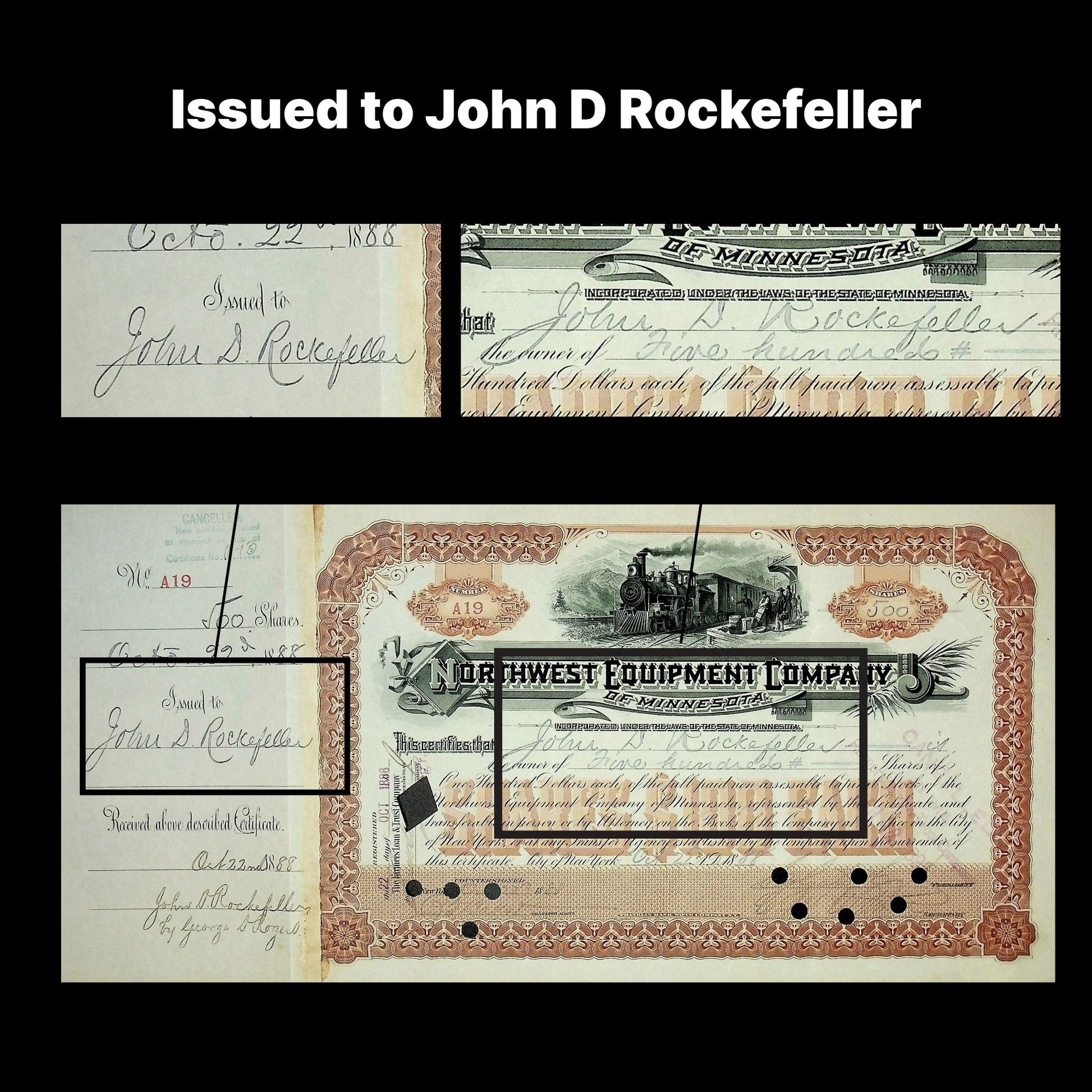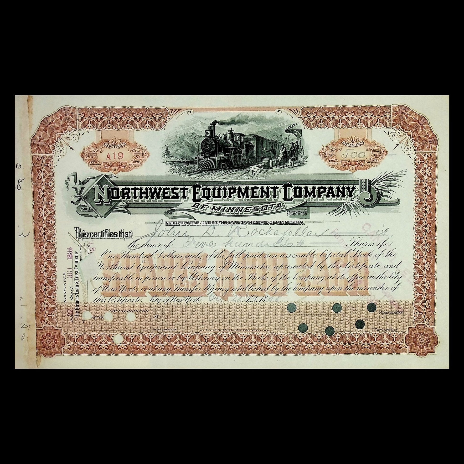 This is a stock certificate from the Northwest Equipment Company of Minnesota, issued in 1888, hand issued to none other than John D. Rockefeller and signed by him on the back. You will receive the exact product shown. Serial number A19. Cancellation holes present. Offered as a collectable.