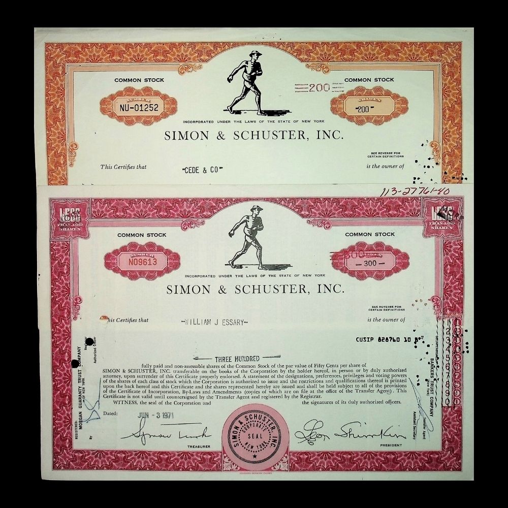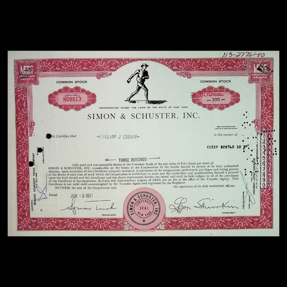 Today, Simon & Schuster remains one of the "Big Five" publishing houses and continues to influence the global literary landscape. This certificate reflects not only the company's commercial legacy but also its enduring role in shaping cultural and intellectual discourse.