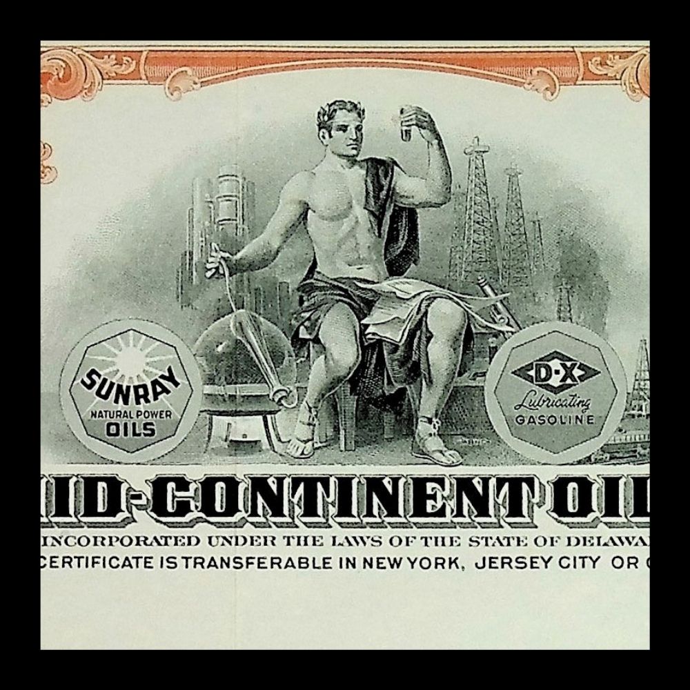 This is a orange Sunray Mid-Continent Oil Company stock certificate from the 1950s. Once representing shares in one of America’s mid-century oil producers, this certificate embodies the energy boom that defined the postwar era. Issued and cancelled offered as a collectable.