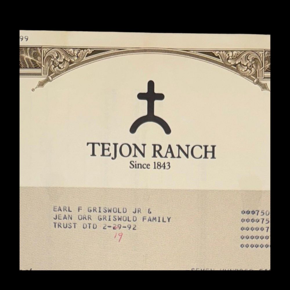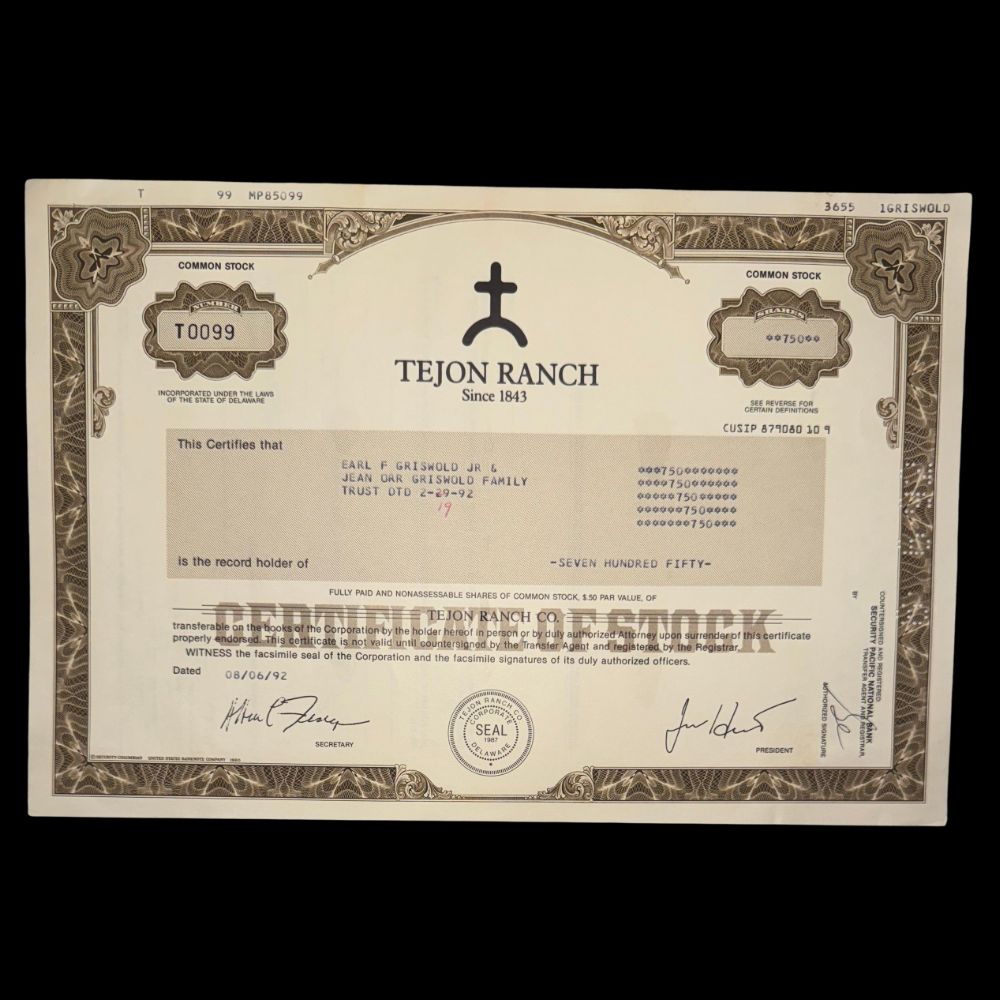 This brown stock certificate from Tejon Ranch, issued in 1990s. Cancellation holes, staple holes and light adhesive mark on back with writing. You will receive a certificate similar to the one shown. Offered as a collectable.